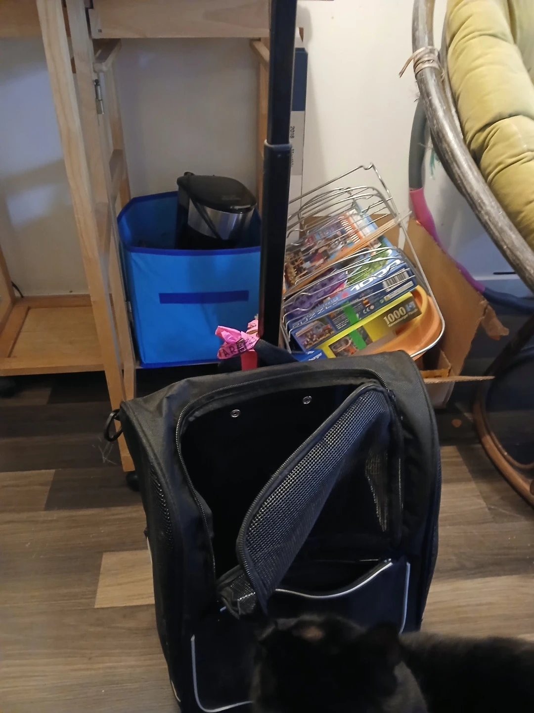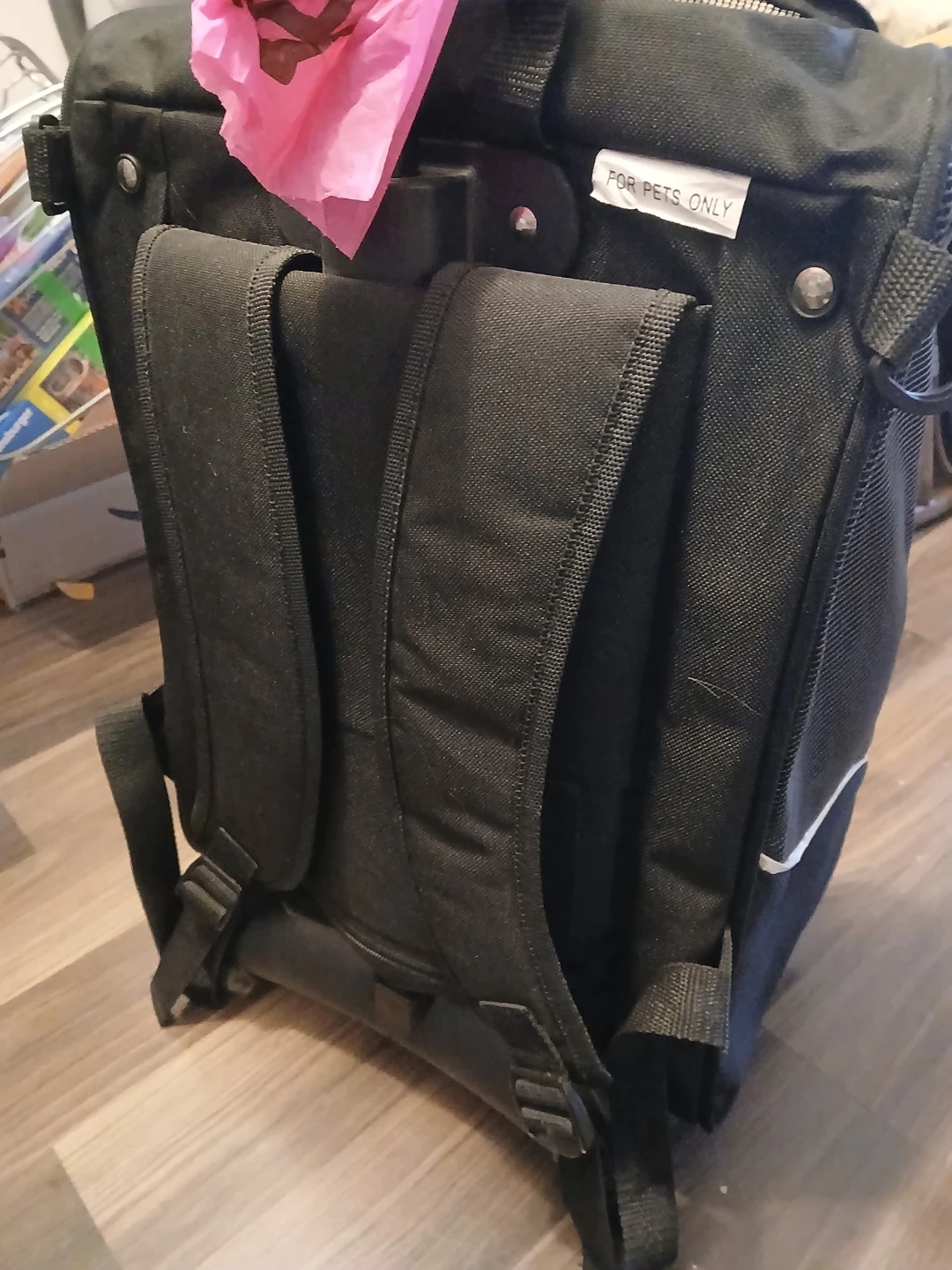 Black rolling pet carrier bag. It has mesh windows for ventilation and a zippered front pocket with a paw print logo. This carrier is labeled "FOR PETS ONLY". Backpack or roll bag