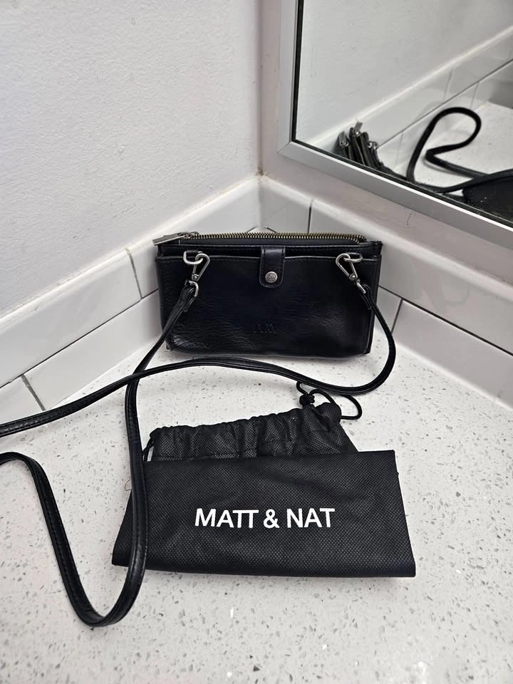 Used about 4 times. Holds a regular-size cell phone. Vegan & Cruelty Free. Comes with dusting bag. Great for going to concerts or events at stadiums.