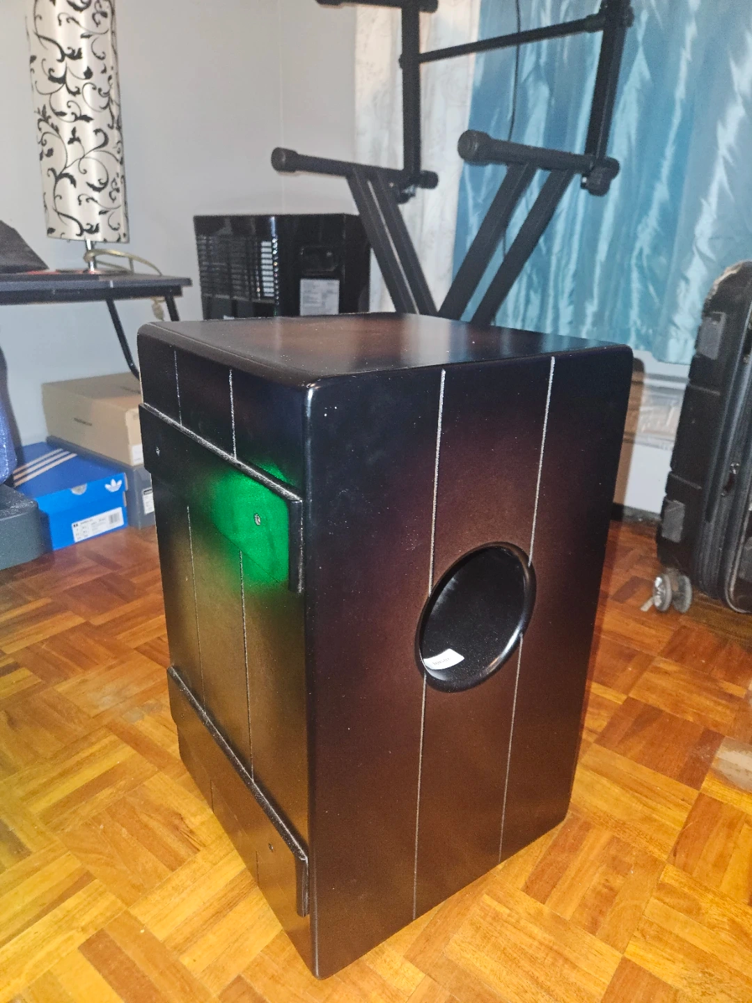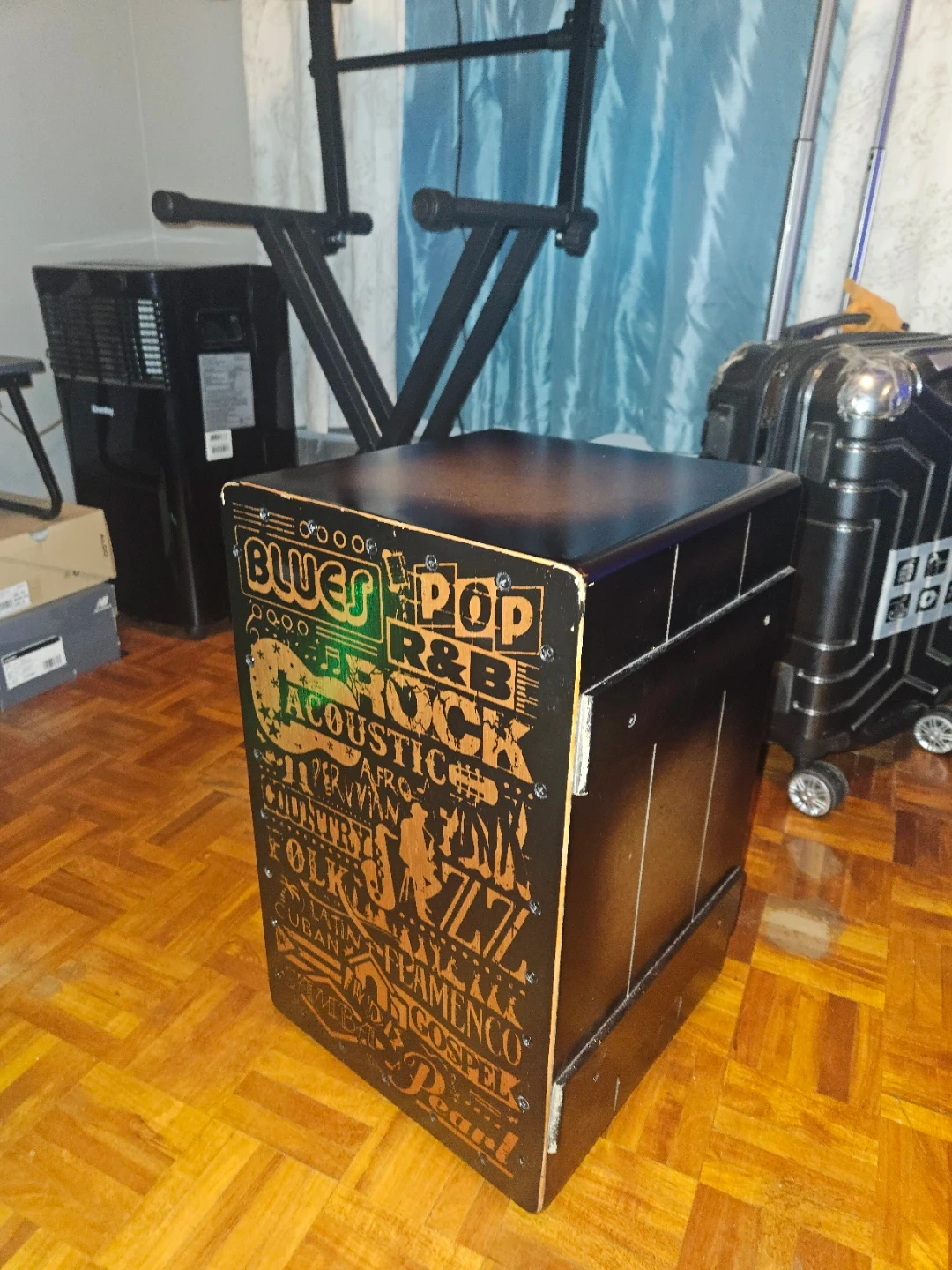 Very good quality wood made Cajon with duel snare strings. I can provide a video so that you can get the performance and hear how it sounds like. Comes with a protective cover.