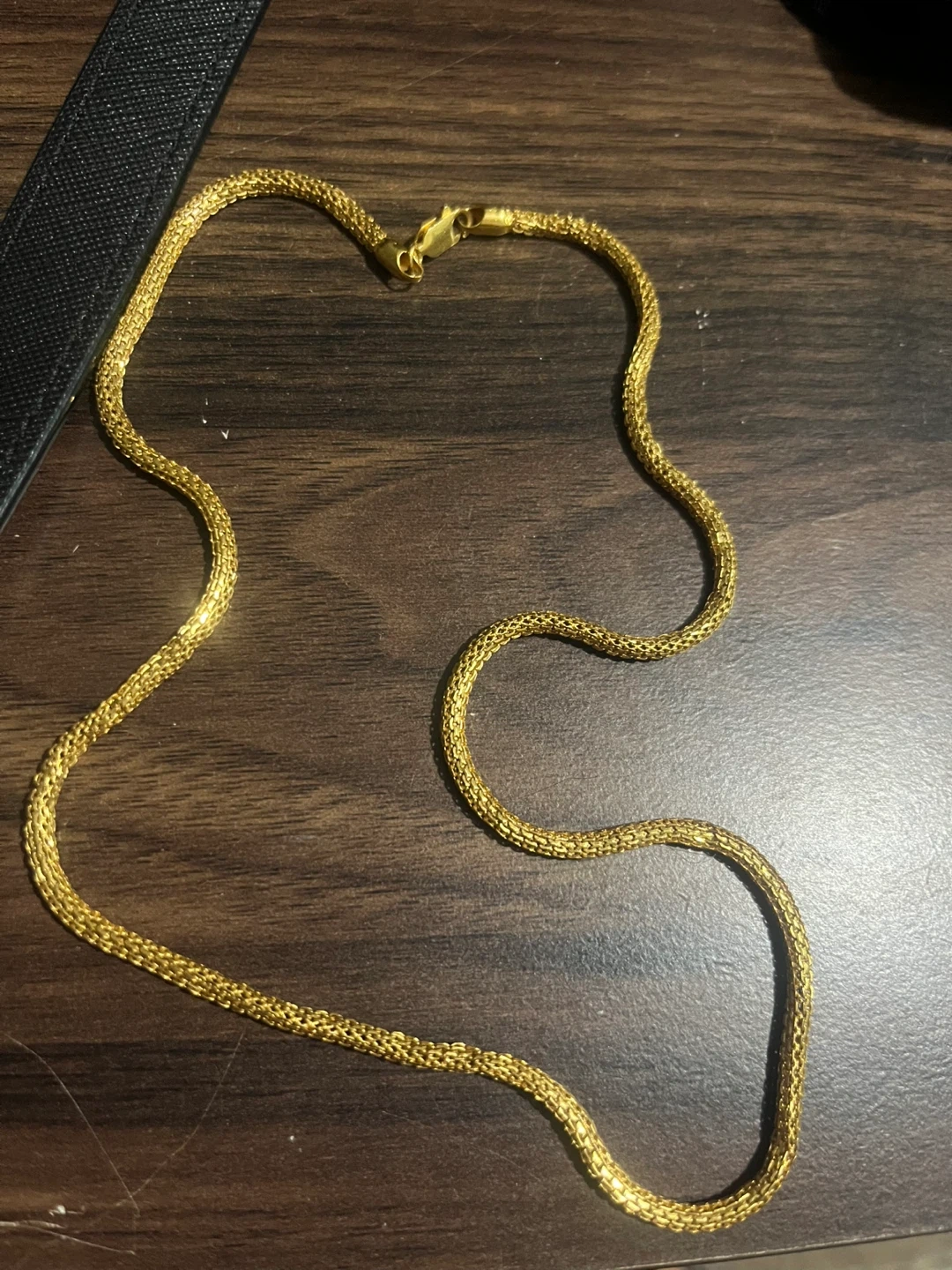Beautiful gold snake chain necklace. It's a timeless piece with a classic design. The chain is approximately 20 inches long. This necklace is perfect for layering or wearing on its own! 16 grams