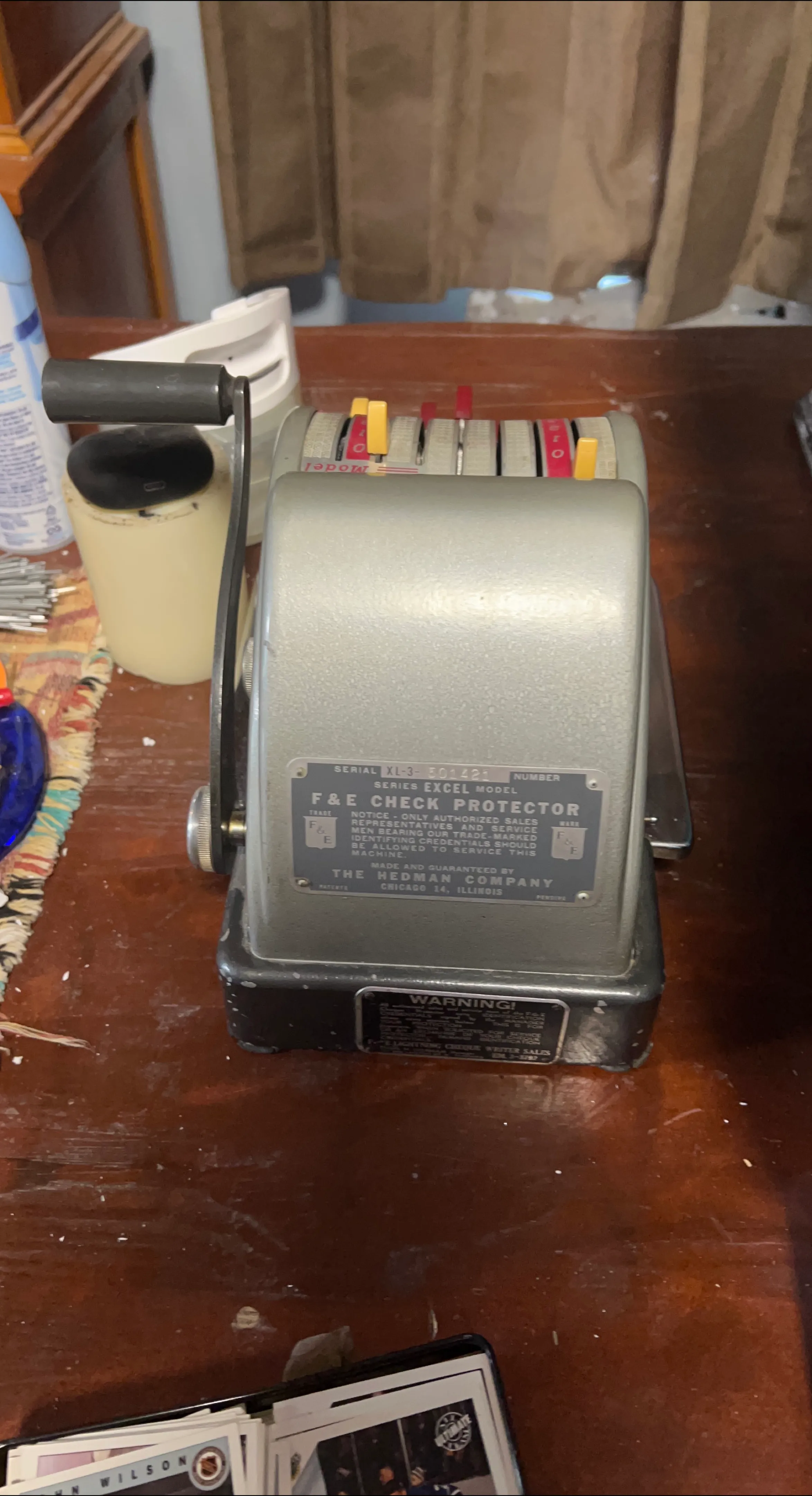 This is an F&E Check Protector, Series Excel Model by The Hedman Company. It features a manual crank and numbered dials for protection. This machine is made and guaranteed by The Hedman Company in Chicago, Illinois. It's useful for businesses needing to secure their cheques.