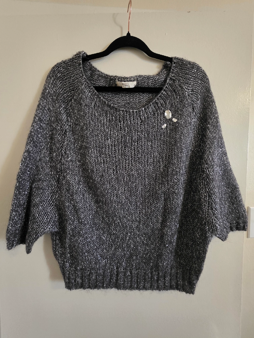 Cozy grey knit sweater in size M! It's made of a blend of viscose, acrylic, mohair, nylon, and polyester. Perfect for staying warm and stylish!