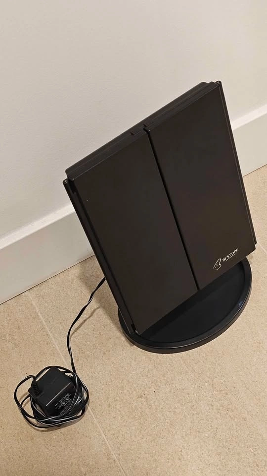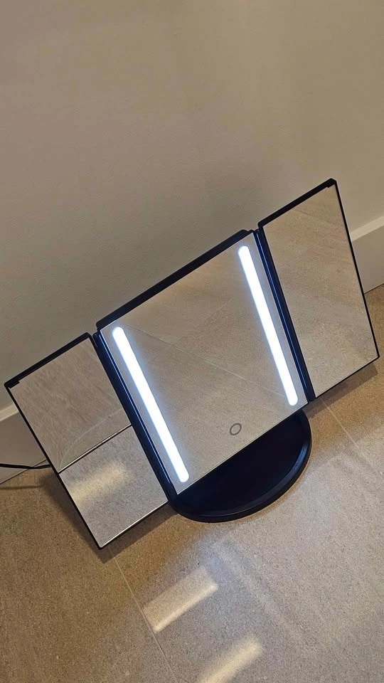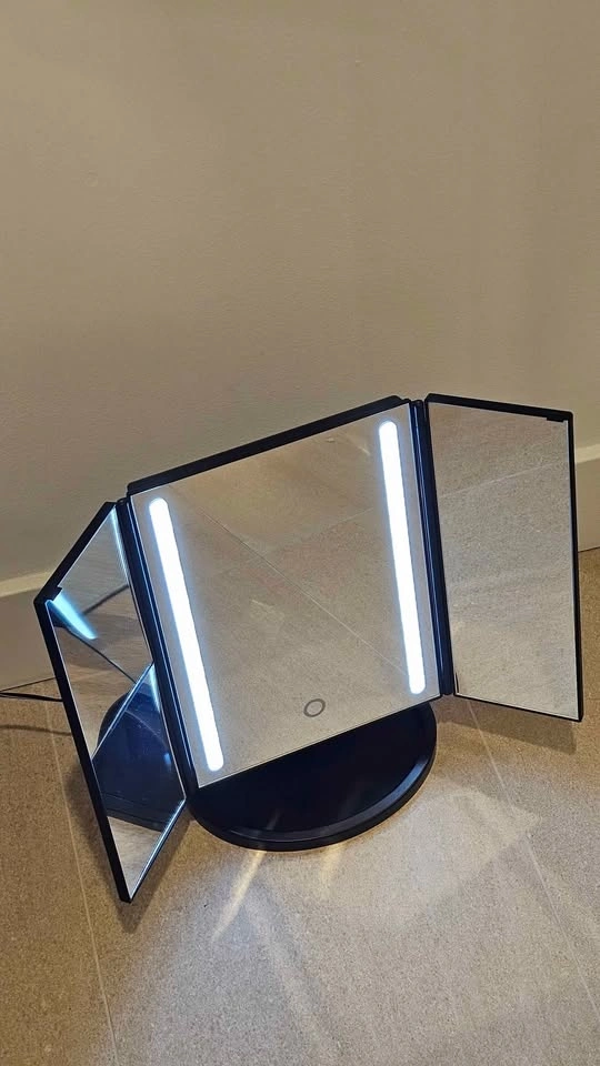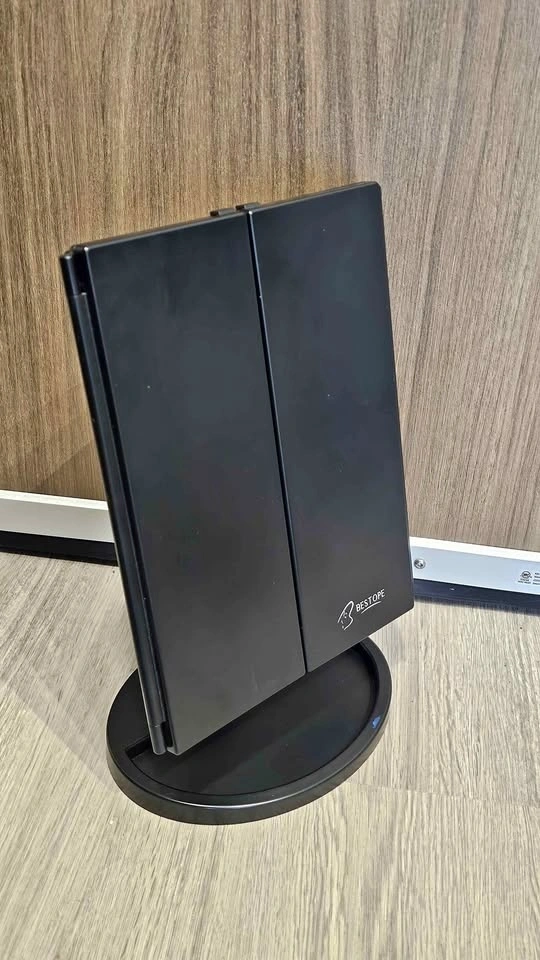 Bright BESTOPE tri-fold makeup mirror with LED lights and a touch sensor. Black color. Sits on a sturdy base. Super handy for getting ready!
