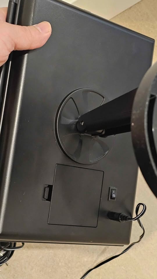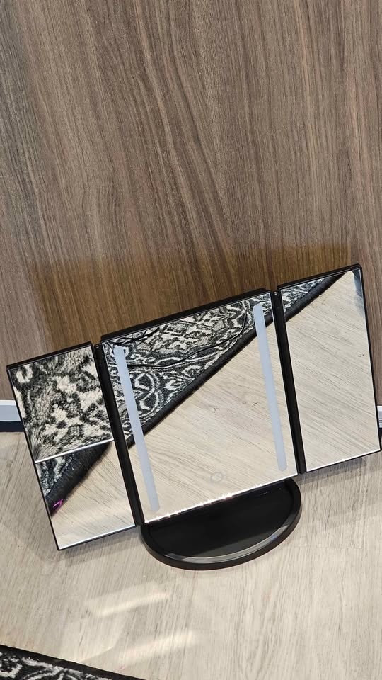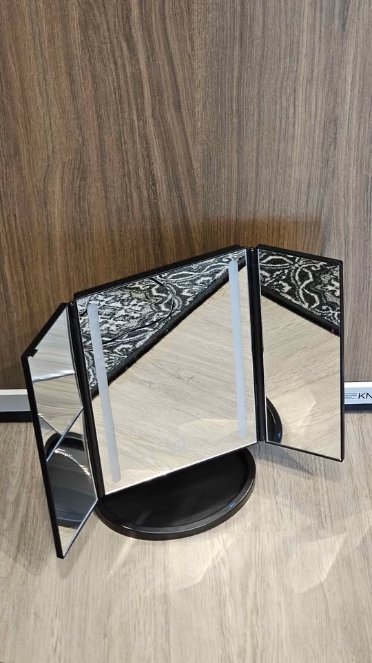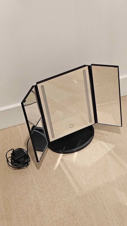 Bright BESTOPE tri-fold makeup mirror with LED lights and a touch sensor. Black color. Sits on a sturdy base. Super handy for getting ready!