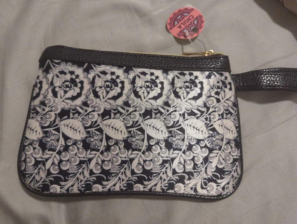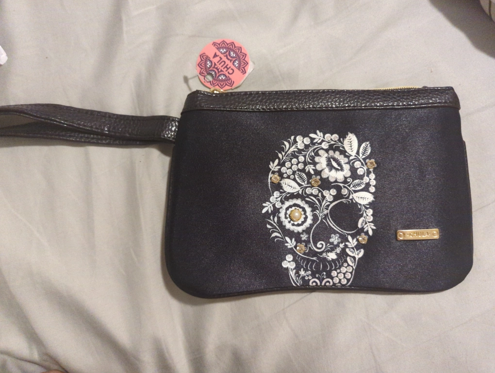Small black clutch with a skull design and pearl eye. Gold zipper and handle. It is lined with black fabric . Bought as a gift from Mexico, but was never able to give it, so it has sat in storage with the tag attached.