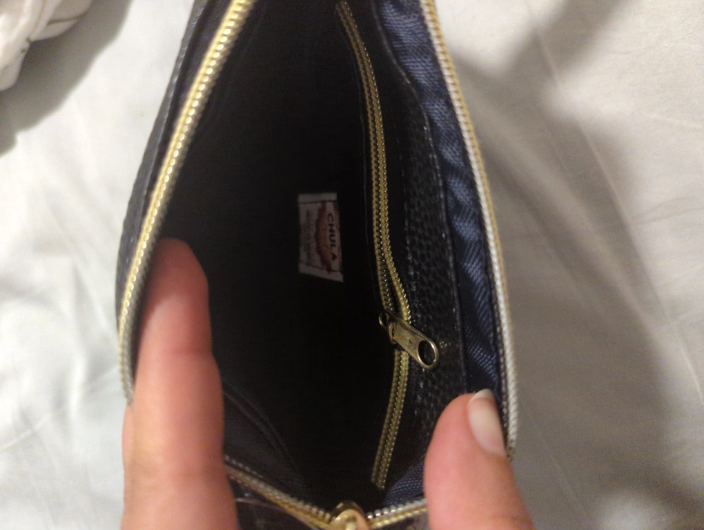 Small black clutch with a skull design and pearl eye. Gold zipper and handle. It is lined with black fabric . Bought as a gift from Mexico, but was never able to give it, so it has sat in storage with the tag attached.