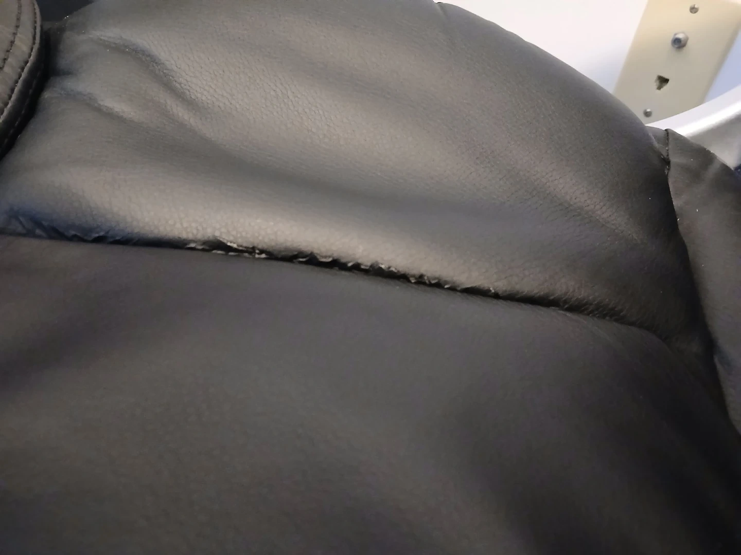 This is a black executive office chair from Sealy. It features a padded seat and backrest with ergonomic armrests. The chair has a five-star base with casters for easy mobility. Some wear is visible on the seat seam.