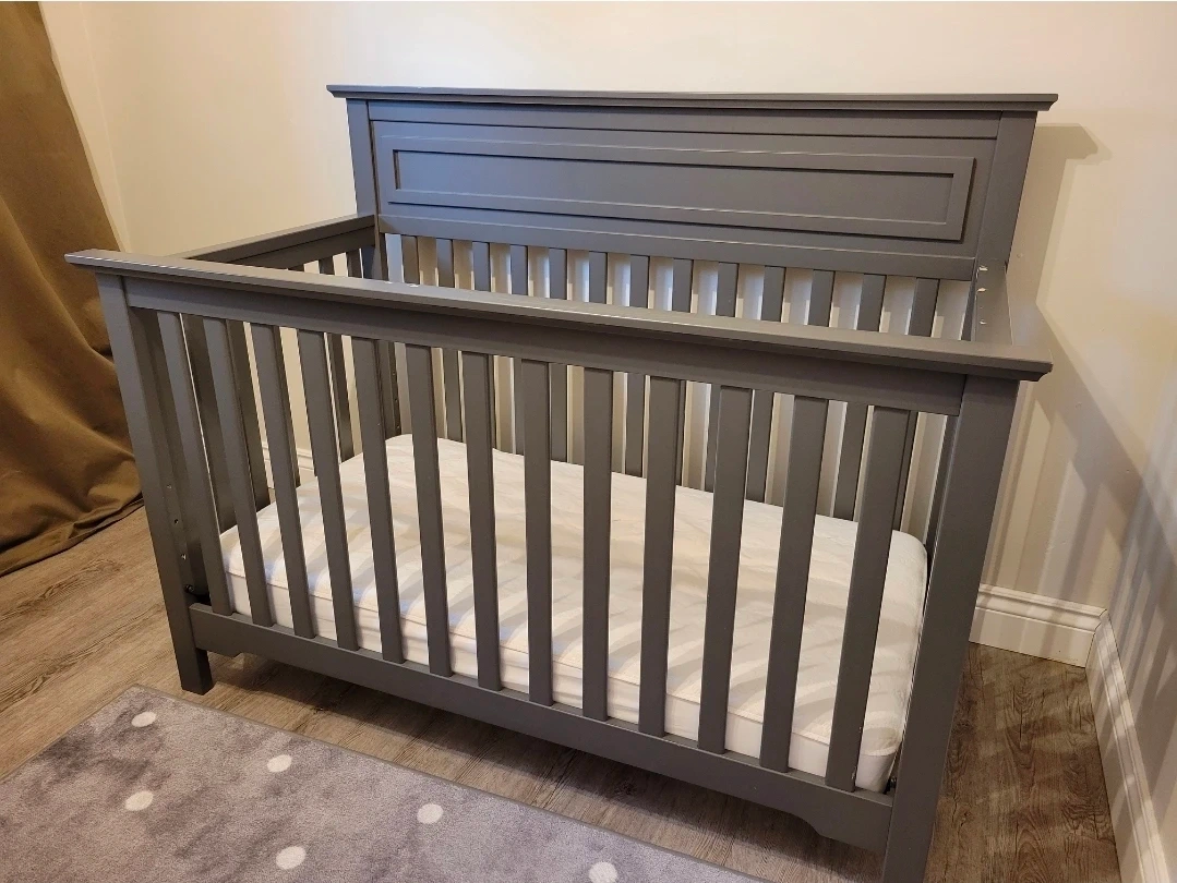 This is a modern style grey crib, suitable for a nursery. The crib's construction is sturdy wood. Convertable to toddler bed. Small damage from teething child. Disassembled for easy transport but all parts accounted for. Mattress NOT included.