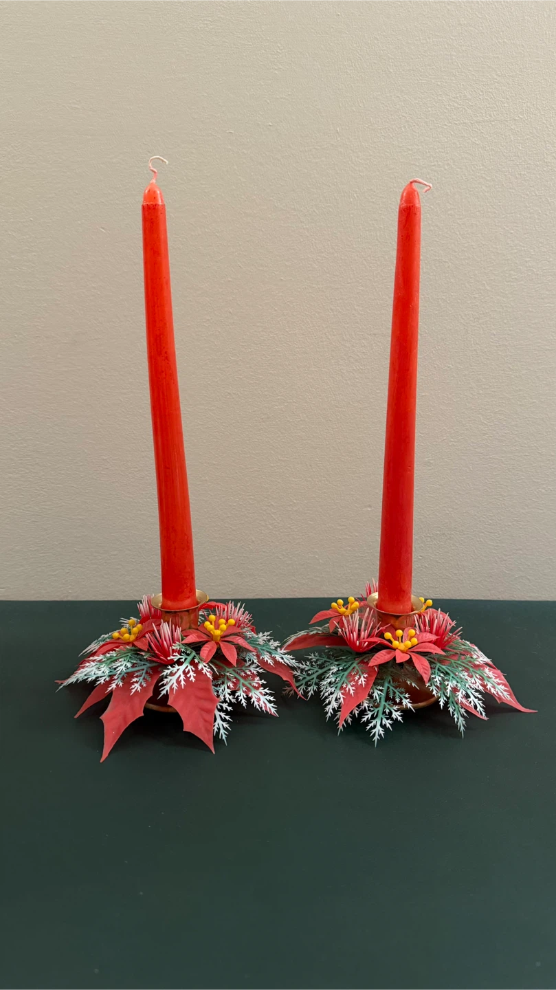 Here's a set of two Christmas candle holders. They feature red candles and poinsettia-like decorations. Perfect for adding a touch of retro holiday charm to your home!