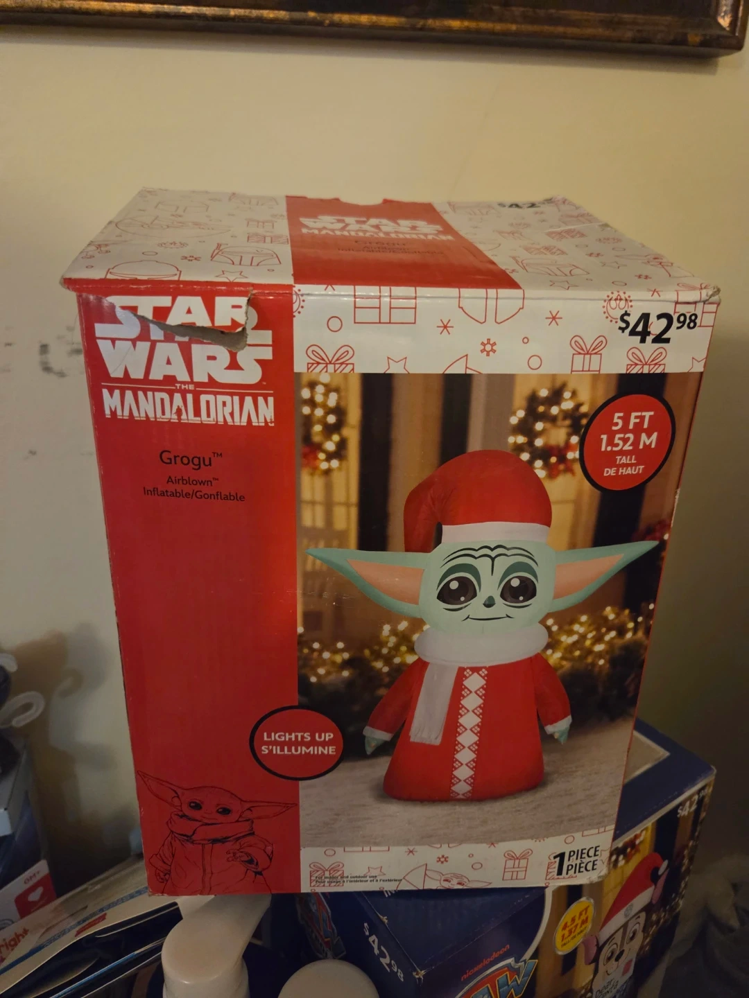 This Star Wars The Mandalorian Grogu Airblown inflatable is 5 feet tall and lights up. It's a fun holiday decoration for any fan! Comes in one piece.