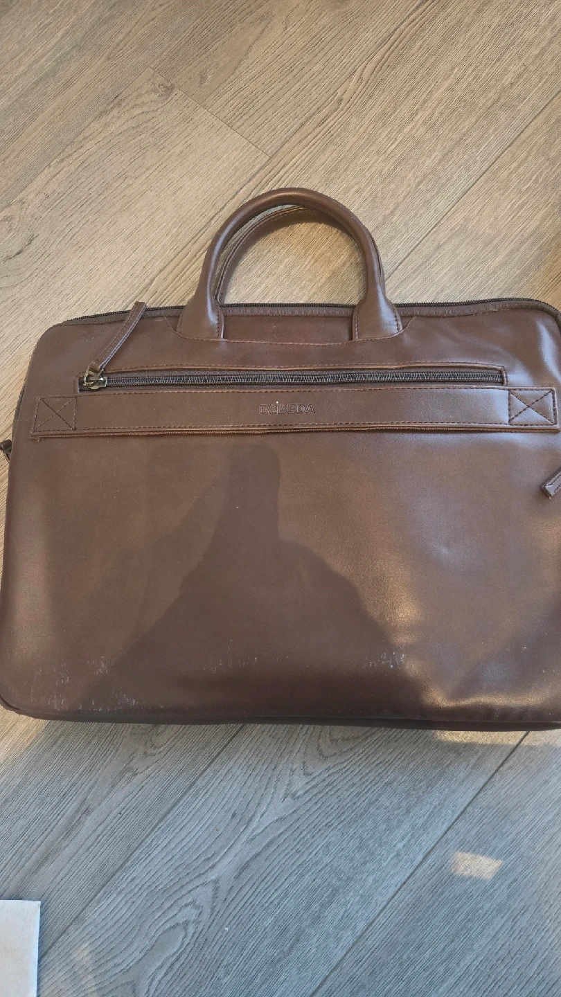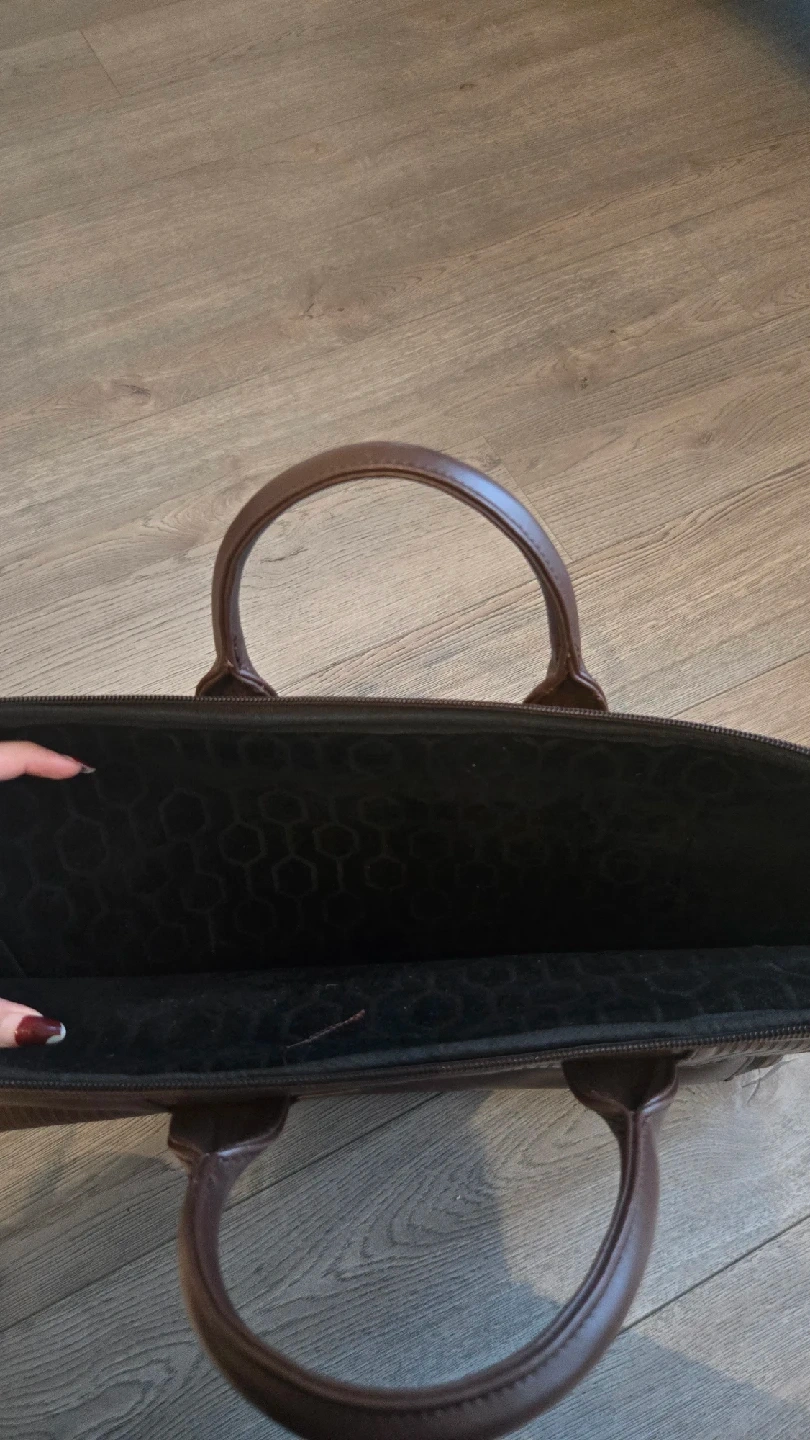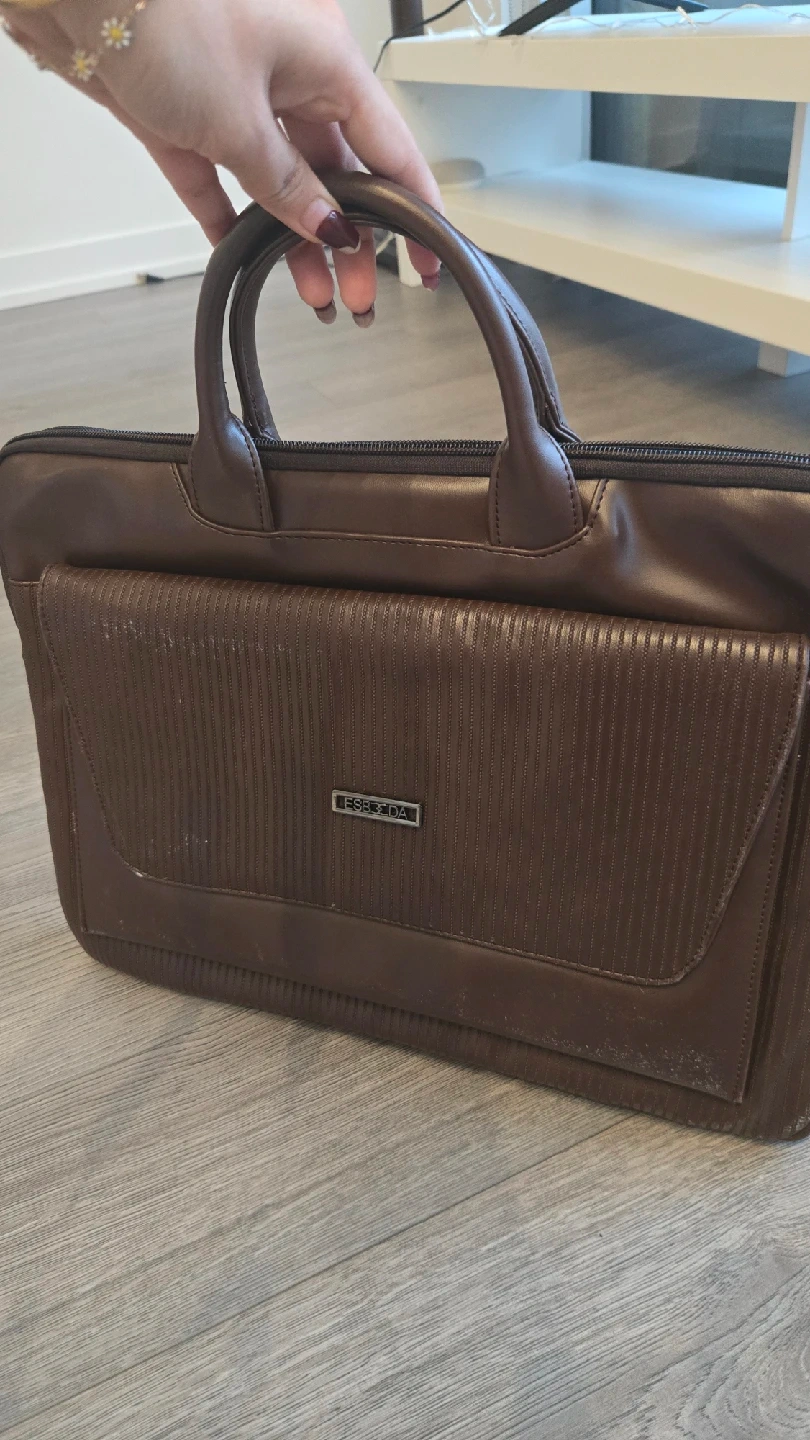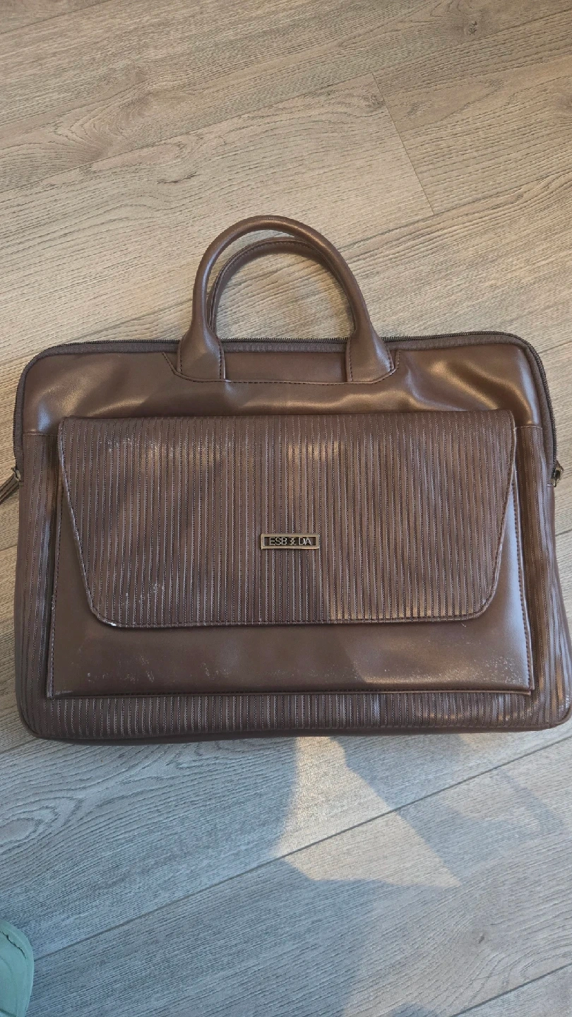 Here's a stylish brown original leather laptop bag from Esbeda. It has a handle on top and a zipper closure. It's perfect for carrying your laptop and other essentials in style!