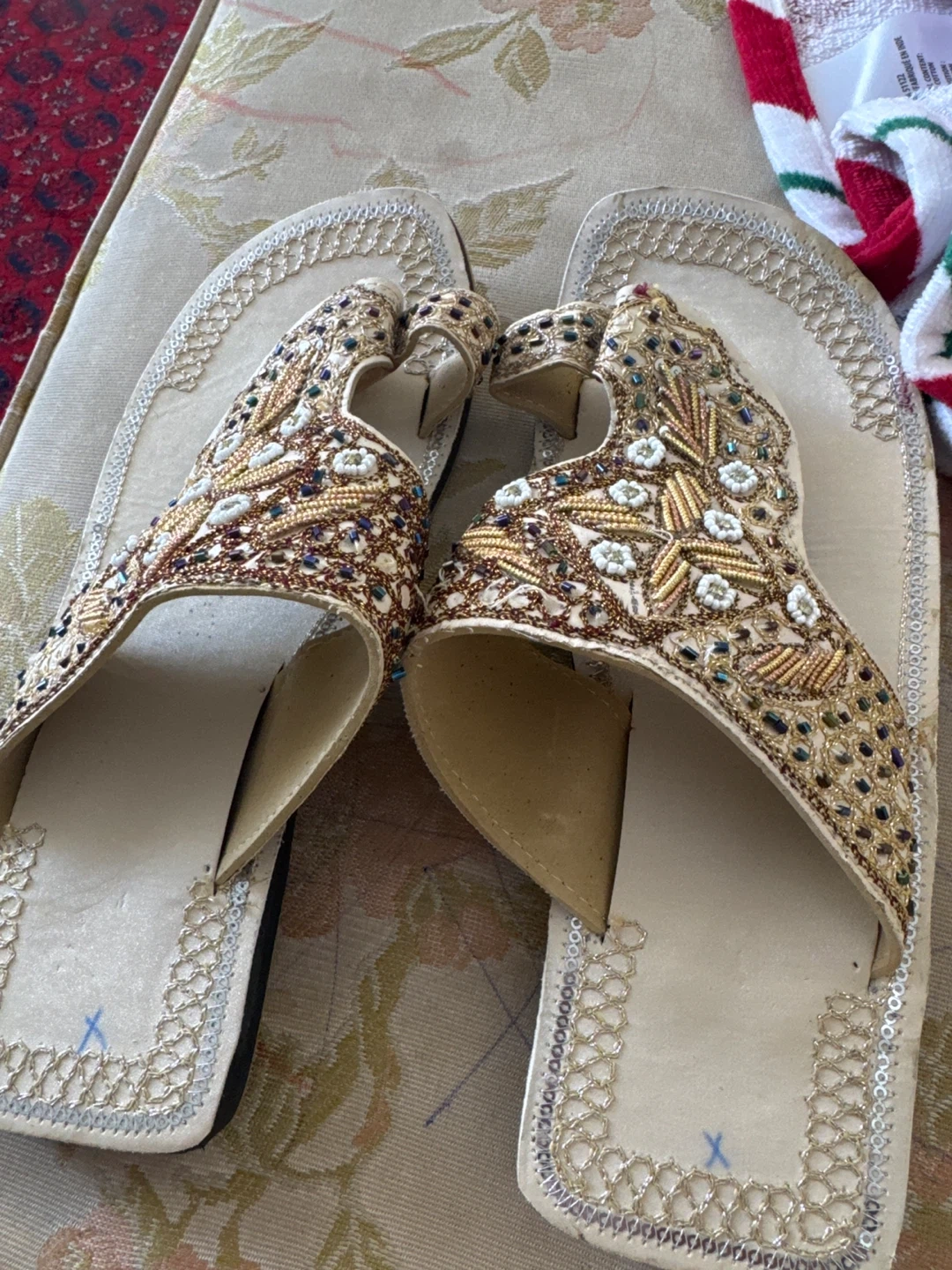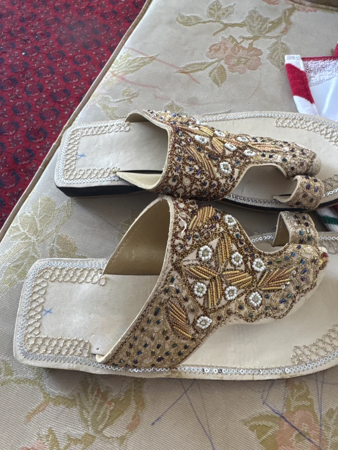 These stylish wedge sandals feature intricate beadwork and embellishments. They have a comfortable cushioned sole and a slight wedge heel. Perfect for adding a touch of sparkle to any outfit!