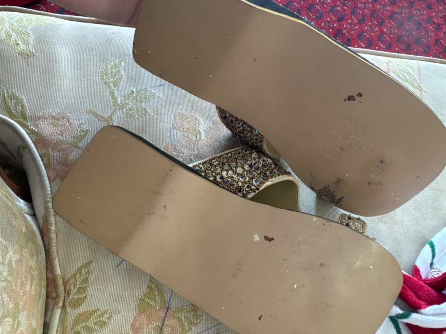 These stylish wedge sandals feature intricate beadwork and embellishments. They have a comfortable cushioned sole and a slight wedge heel. Perfect for adding a touch of sparkle to any outfit!