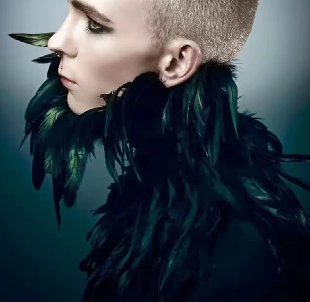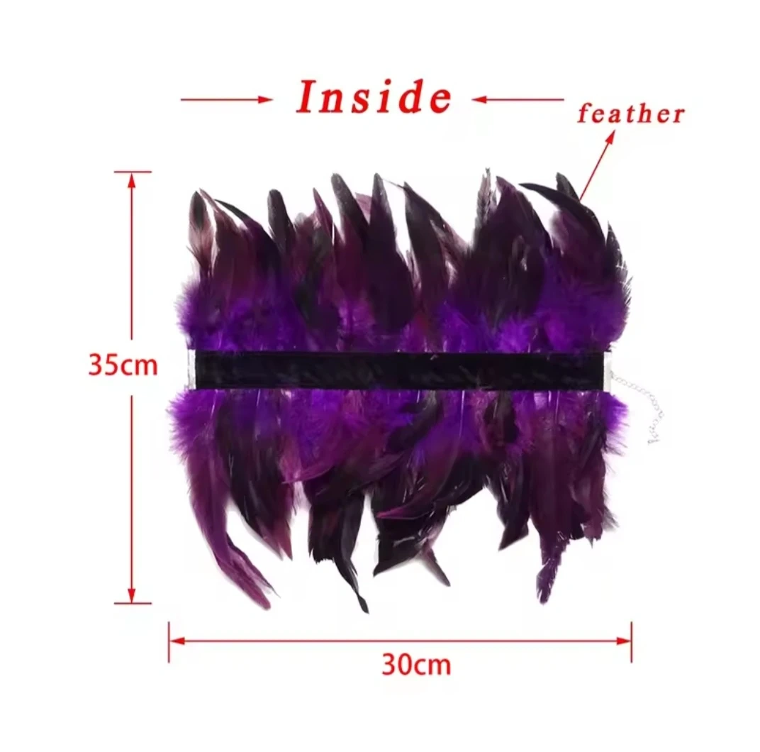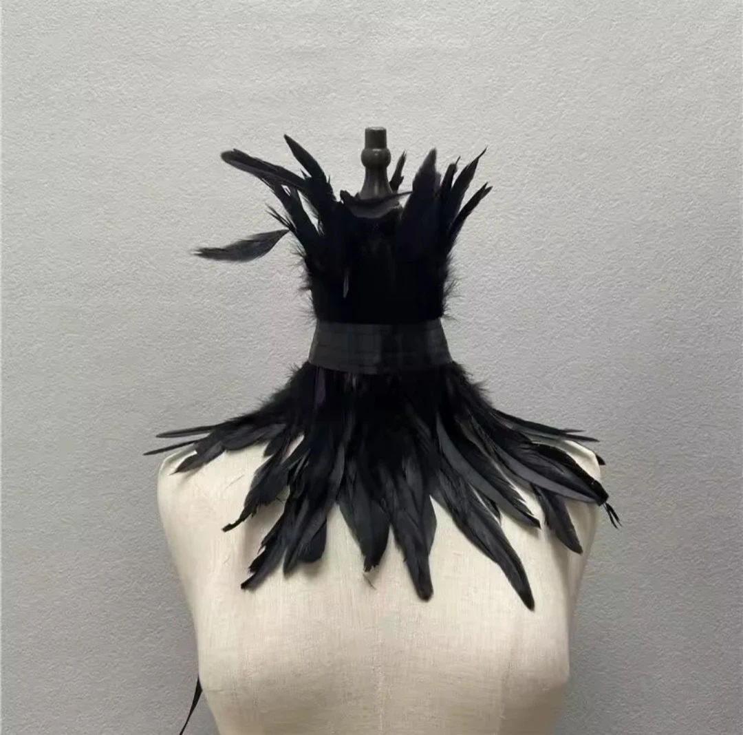 This dramatic feather collar is perfect for costumes or statement wear. It measures 30cm wide and 35cm high. The black feathers create a bold, eye-catching look. It's made with real feathers attached to a fabric band.