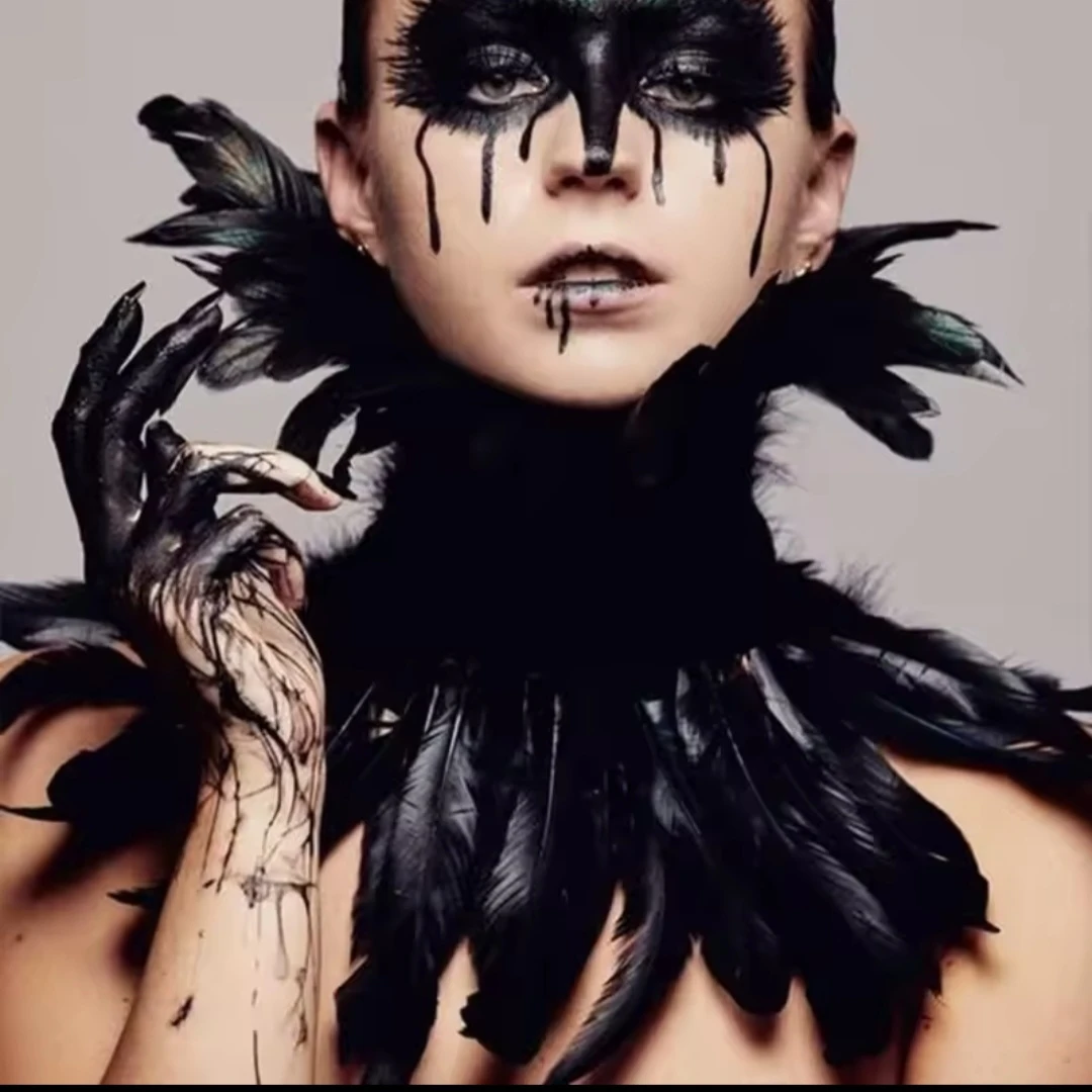 This dramatic feather collar is perfect for costumes or statement wear. It measures 30cm wide and 35cm high. The black feathers create a bold, eye-catching look. It's made with real feathers attached to a fabric band.