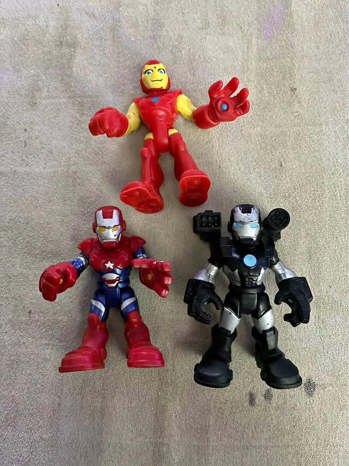These toys feature Iron Man, Iron Patriot, and War Machine characters. They are designed for young children and produced by Hasbro, encouraging imaginative play with various Marvel heroes.