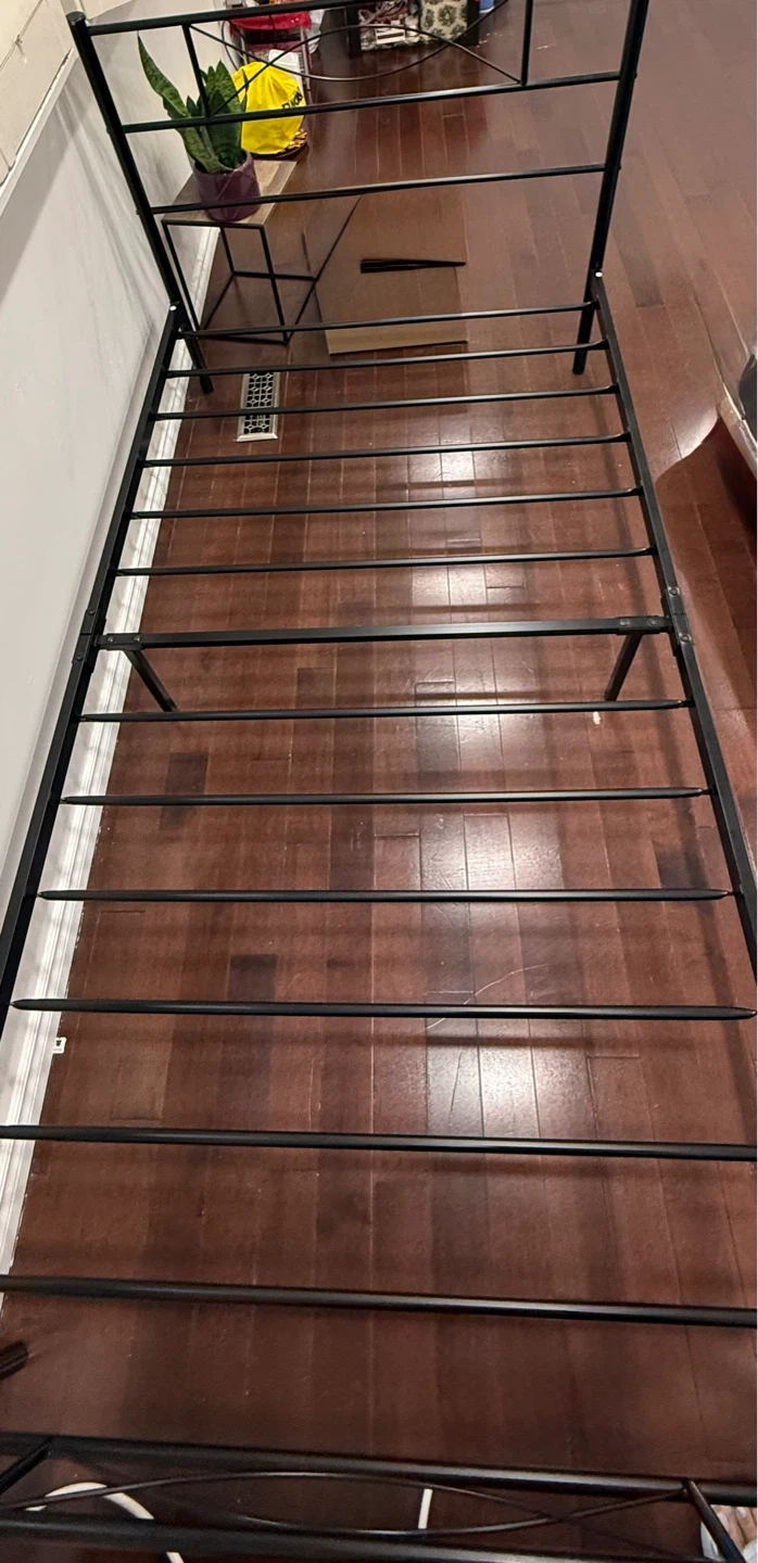 This is a black metal bed frame. It's designed for a twin-sized mattress. The frame's sturdy construction provides reliable support.