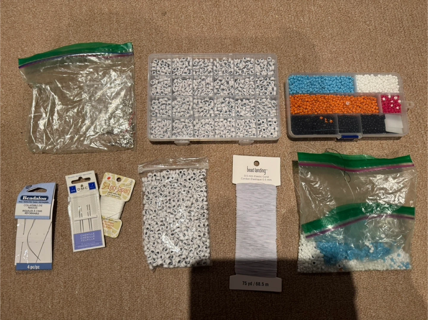 This is a craft kit for making bracelets and jewelry. It includes letter beads, colourful pony beads, elastic cord, jump rings, and needles. Great for DIY projects!