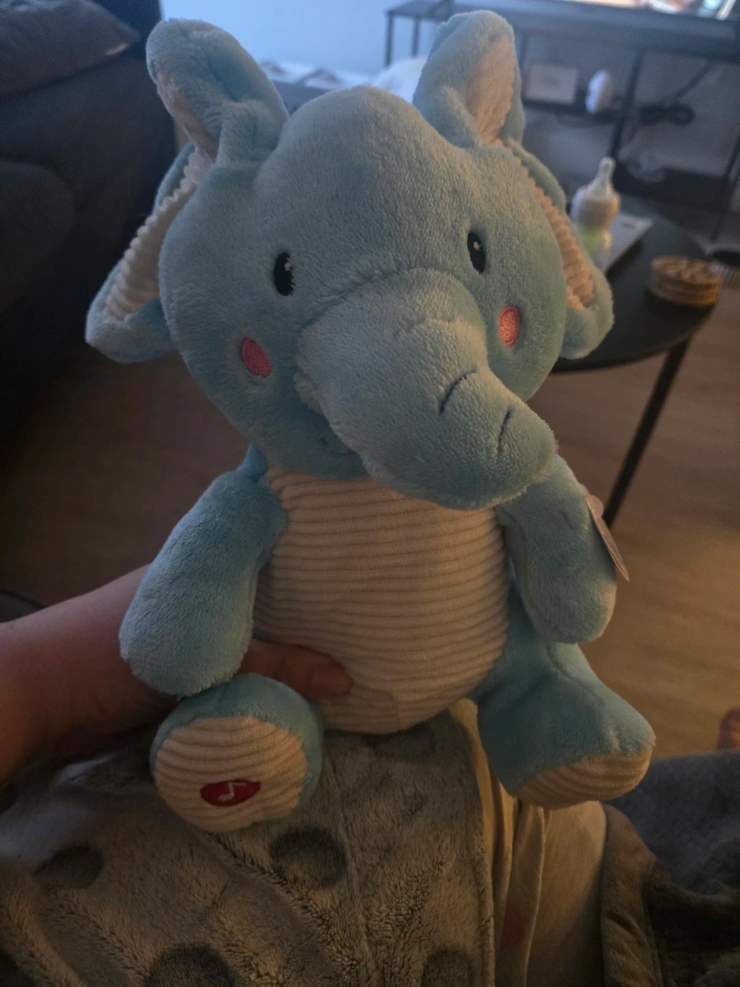 A super soft blue elephant plush toy with striped accents. It has pink rosy cheeks and a heart-shaped musical note on one of its feet. Perfect for a baby's nursery or as a cuddly friend.