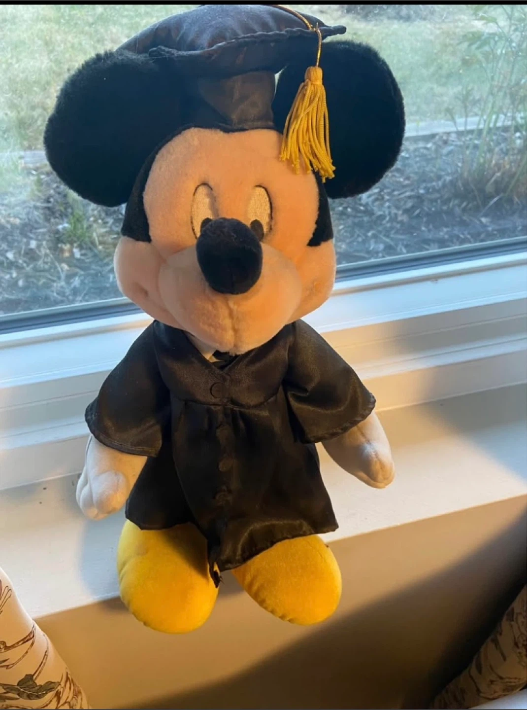 Here's a Mickey Mouse plush dressed in a graduation gown and cap! It's in great condition and would be perfect for a graduation gift or a Disney collector