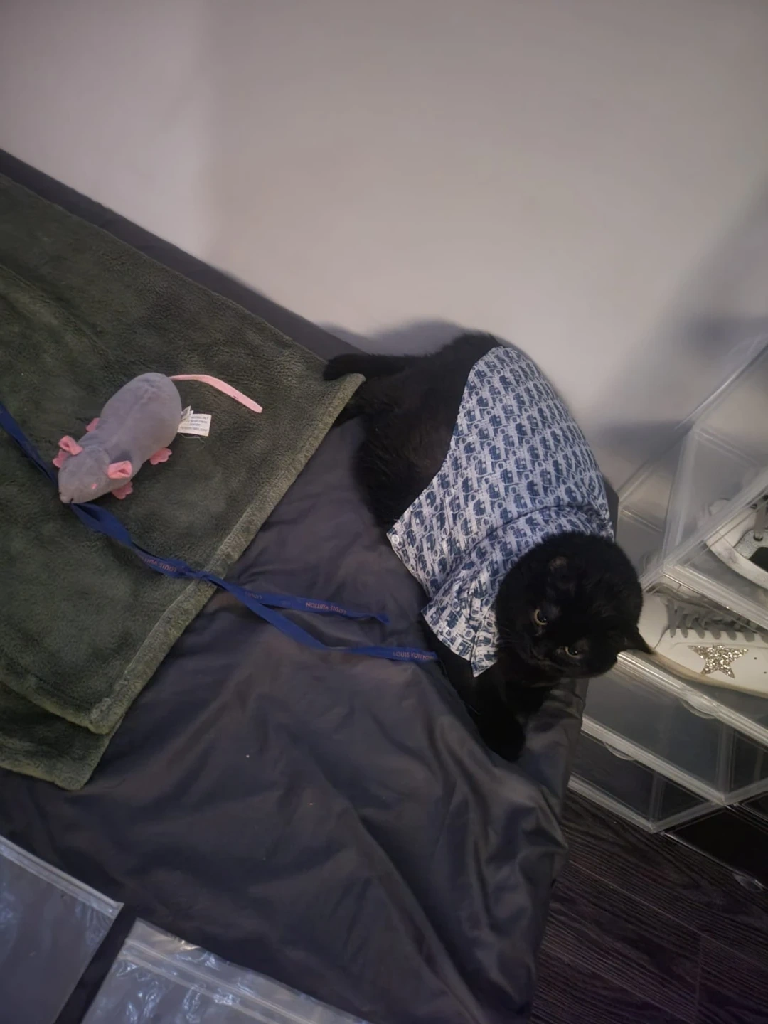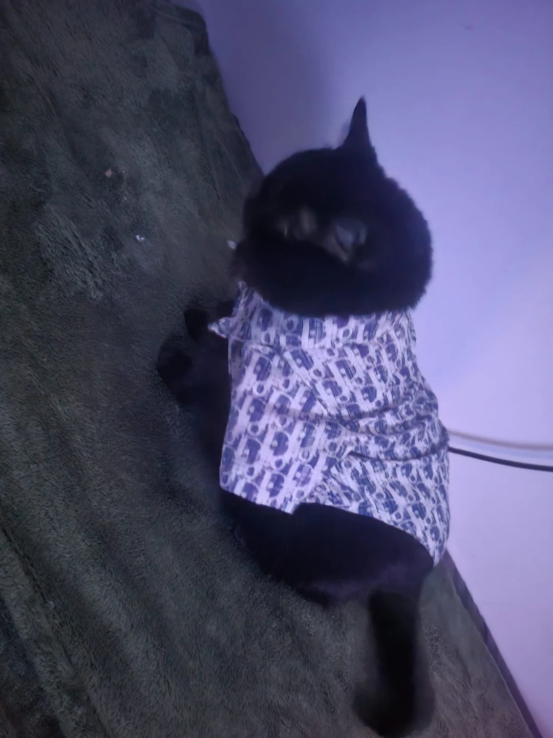 This is a pet shirt with a repeated logo pattern. It's designed for a pet and has a button-up front.
