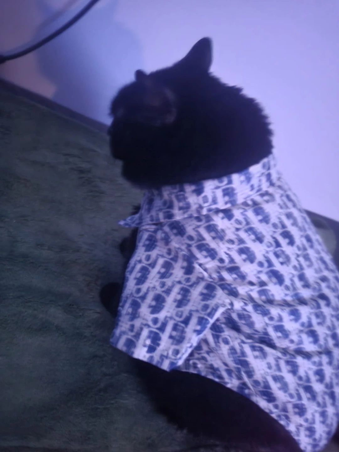 This is a pet shirt with a repeated logo pattern. It's designed for a pet and has a button-up front.