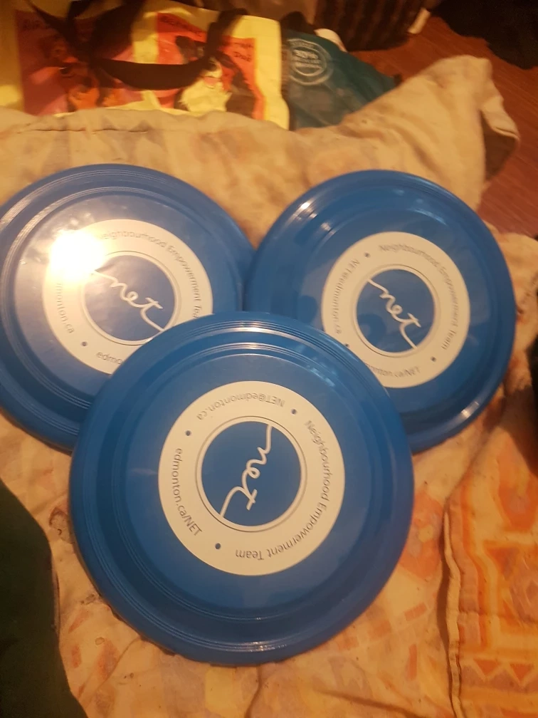 Selling three blue frisbees from the Neighbourhood Empowerment Team (NET) Edmonton. Great for some outdoor fun!