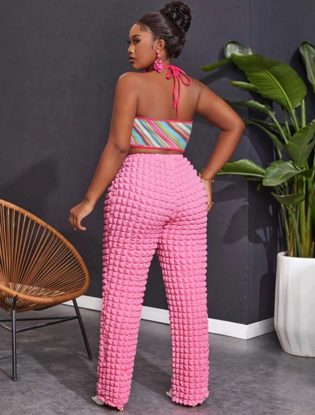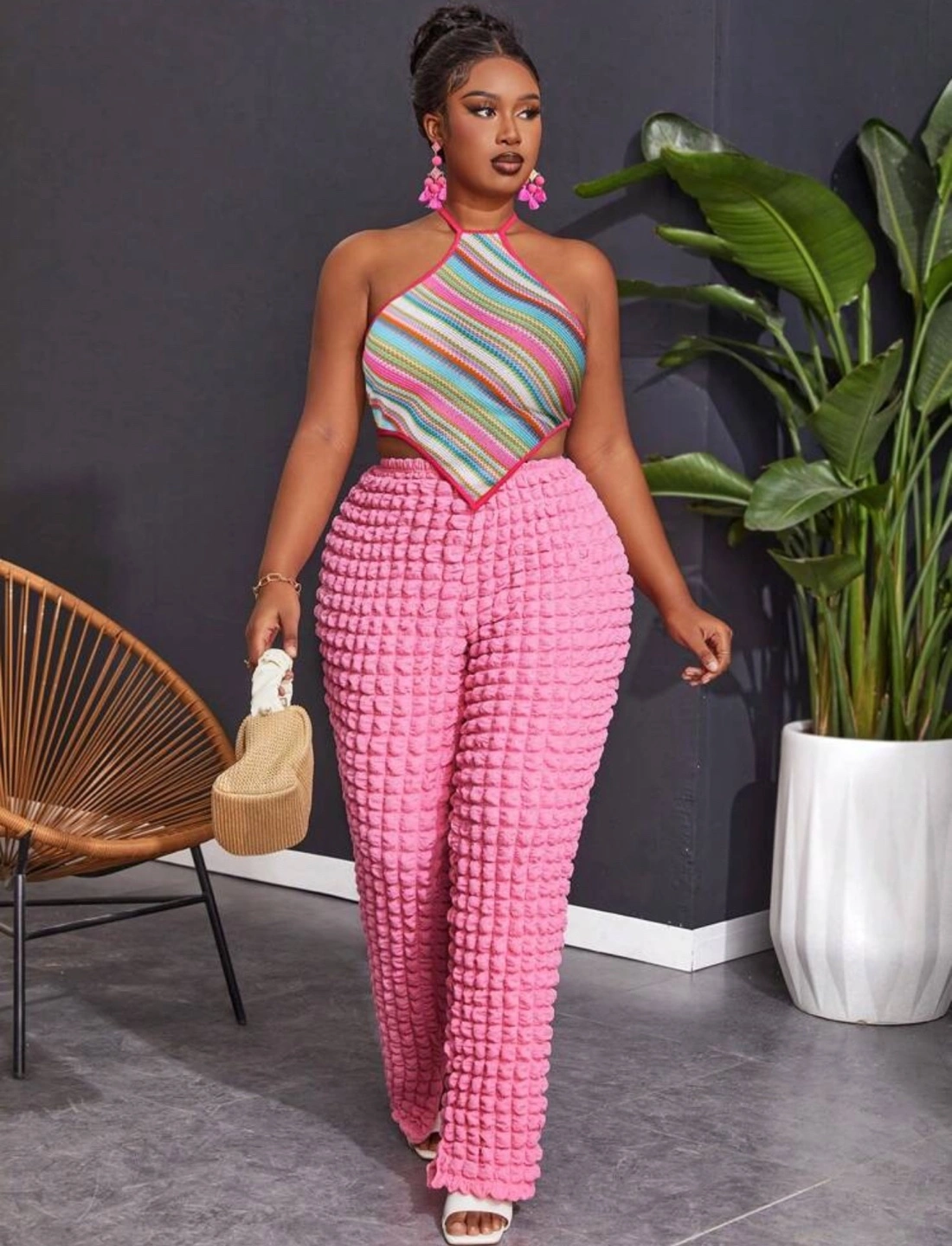 Stylish two-piece outfit. Features a colourful striped halter crop top and bubble textured pink pants. Perfect for a fun night out or casual wear. Excellent condition.