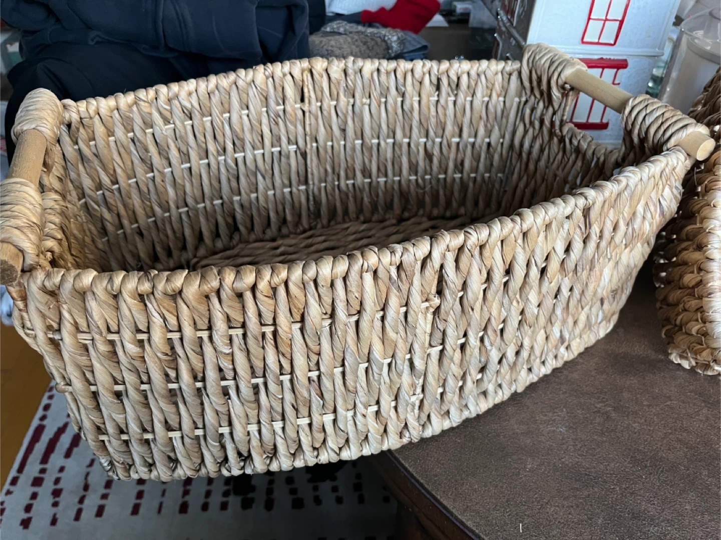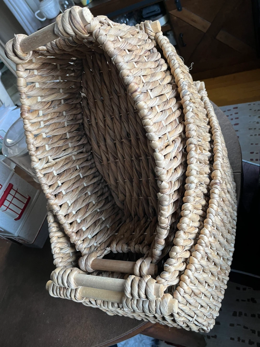 Set of three woven baskets with wooden handles. Perfect for organizing shelves or storing household items. Made from natural woven material.