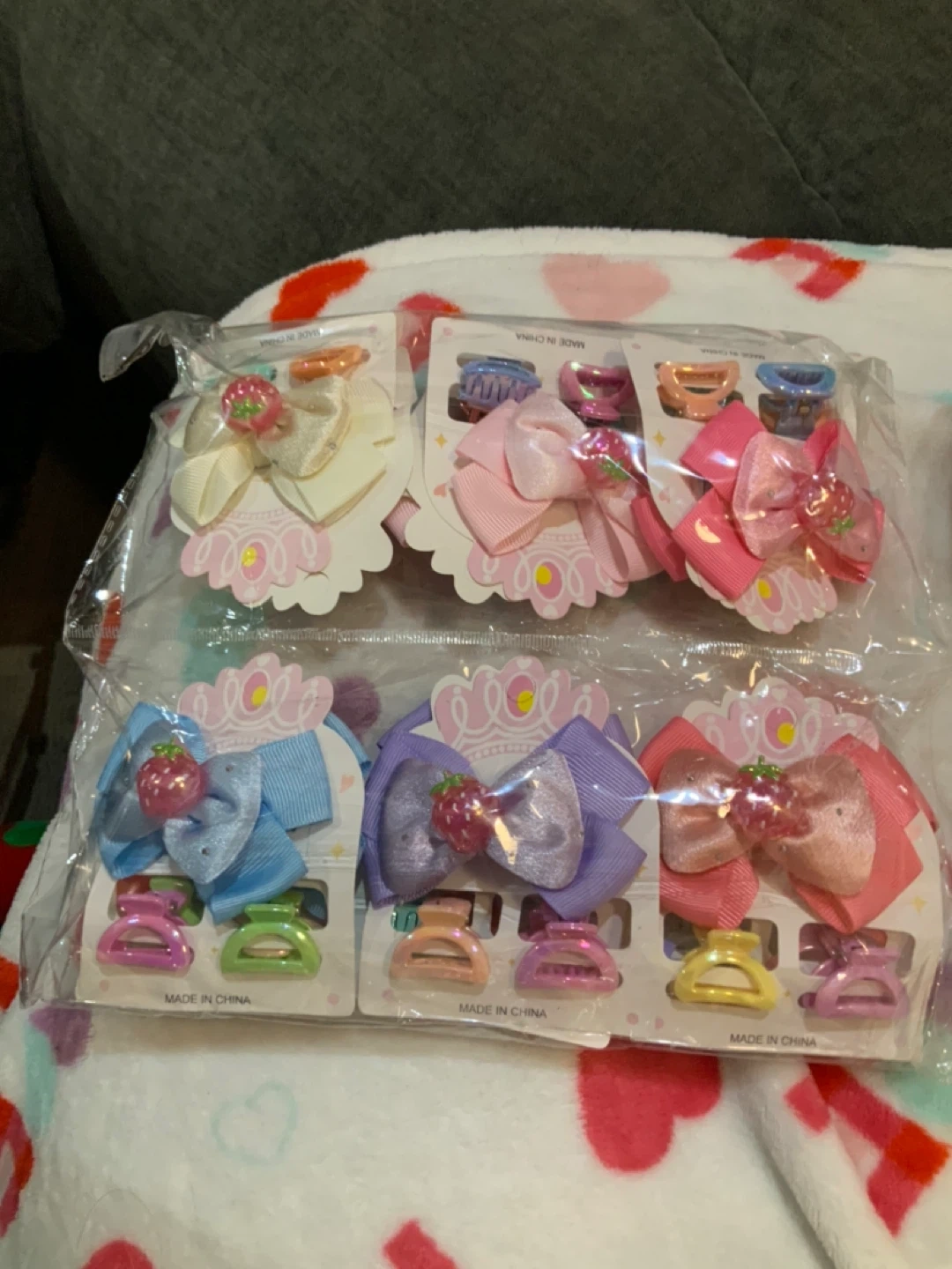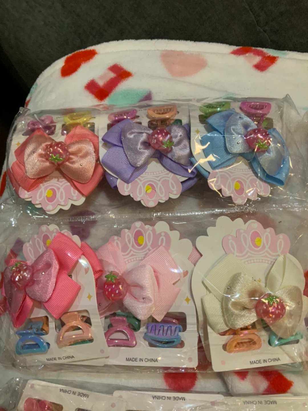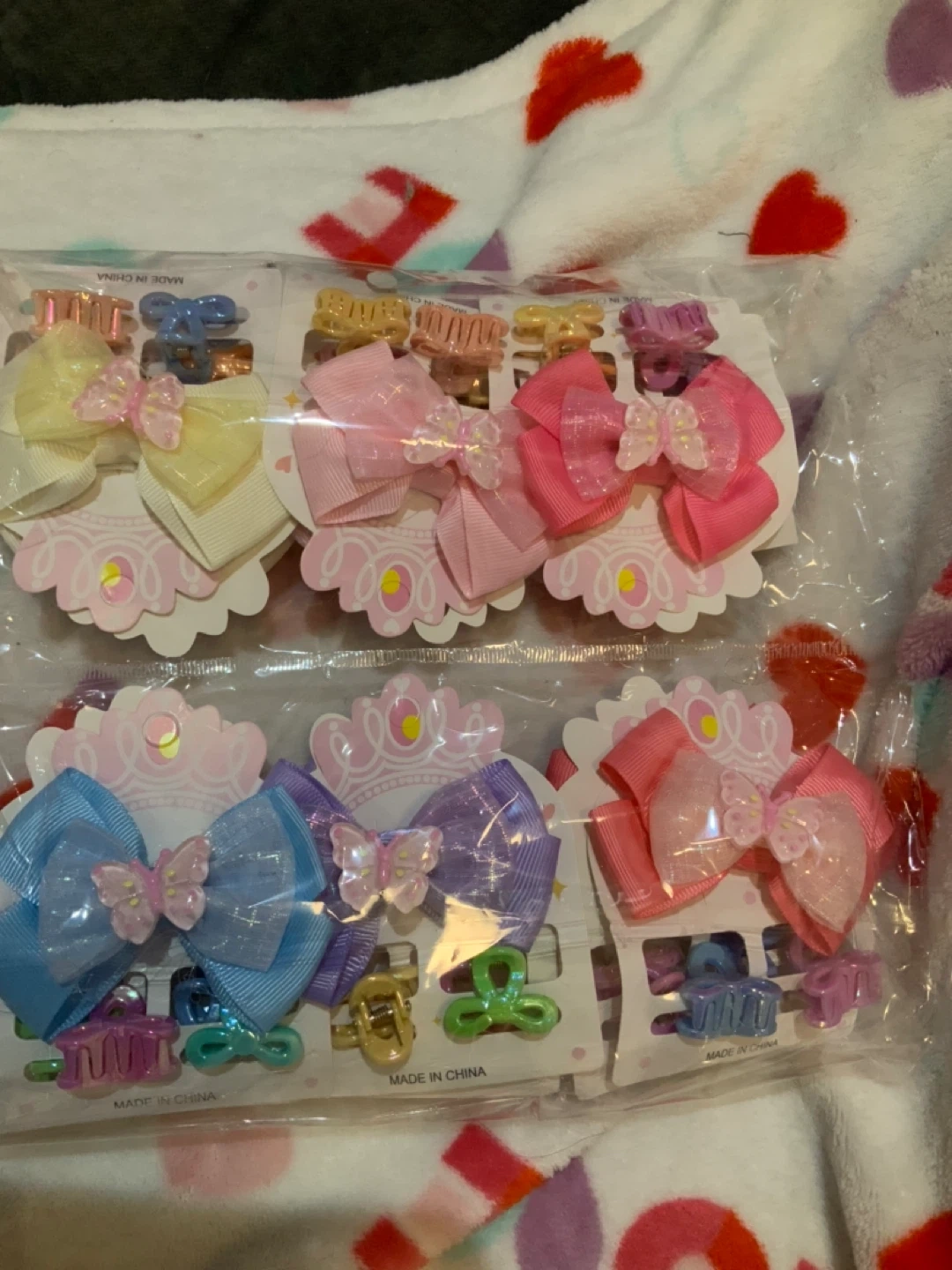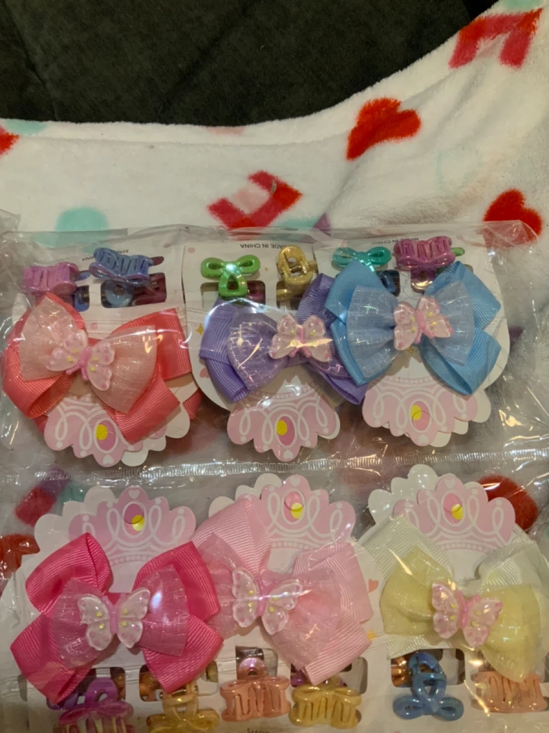 Bow and hair clips with colorful bows and decorative charms. Features include various pastel colors like pink, purple, and blue. Each clip is a small claw style, perfect for securing hair. They're great for kids' hairstyles! For $2 each piece