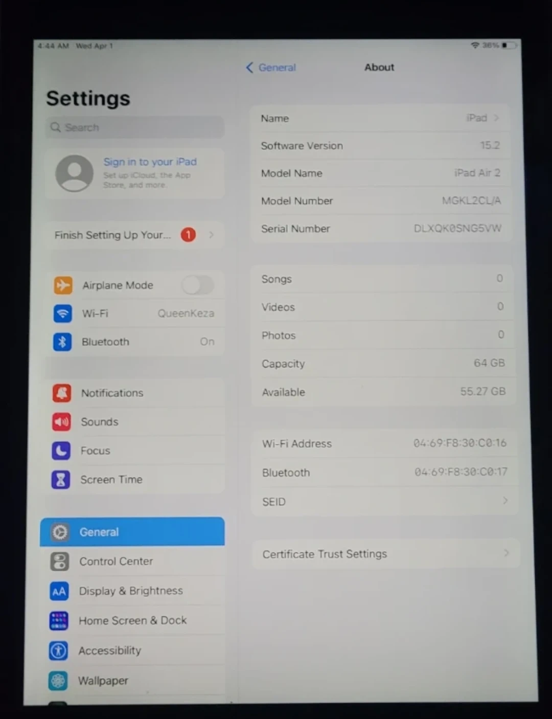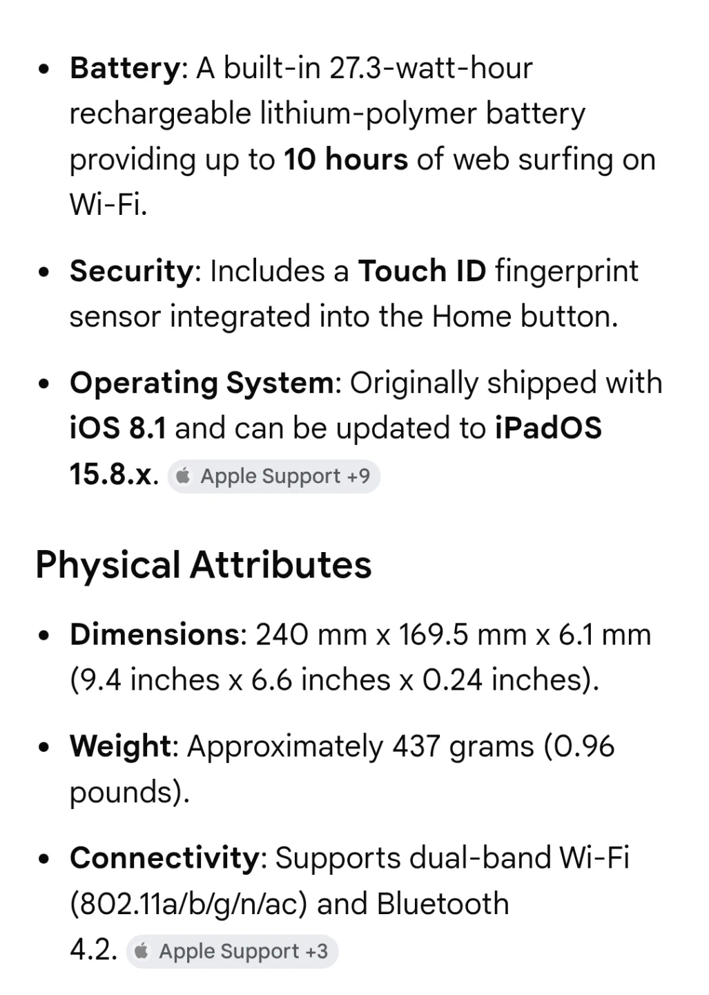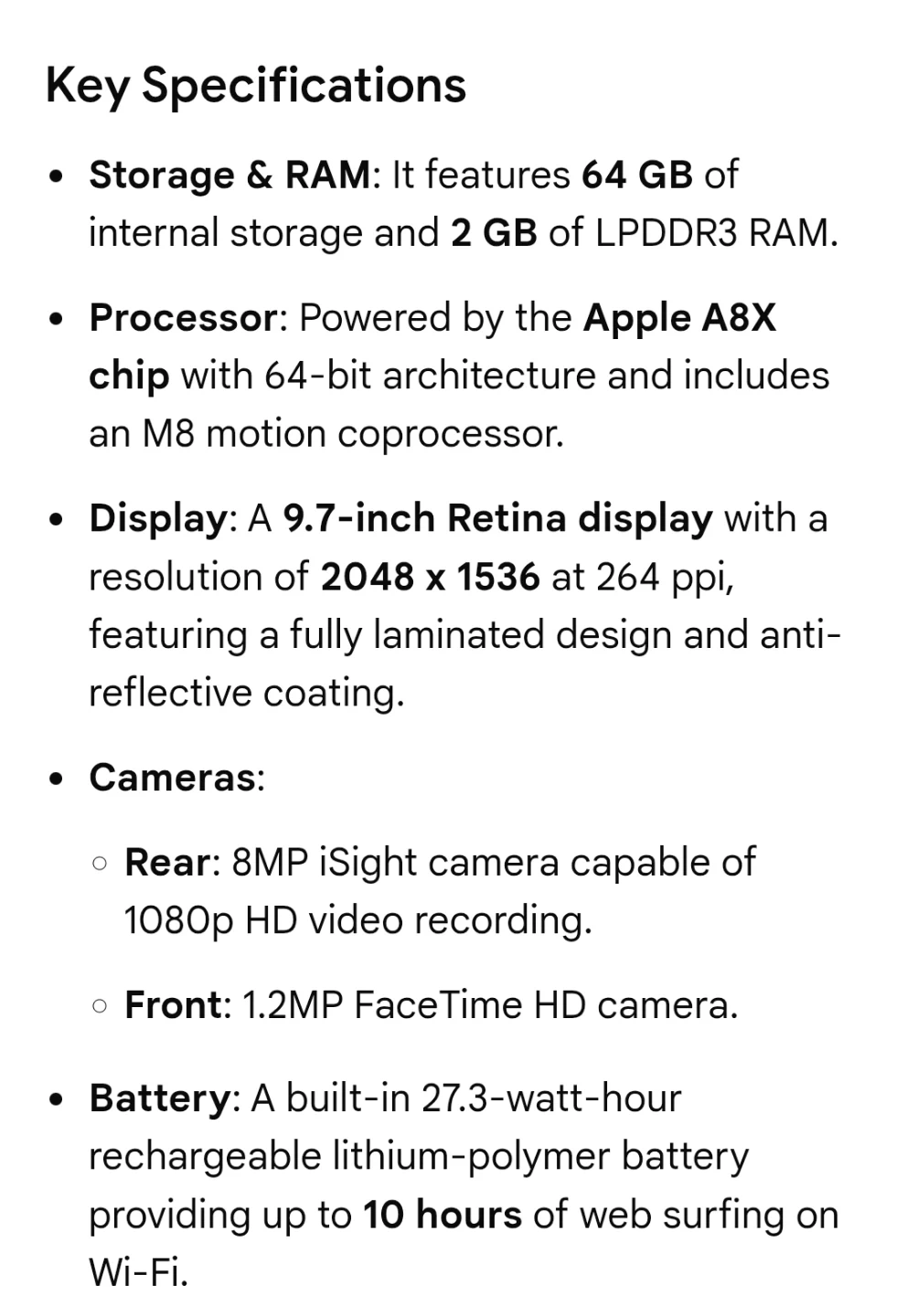 This is an Apple iPad Air 2 with 64GB of storage in space grey. Features a 9.7-inch Retina display and the A8X chip. Good battery.