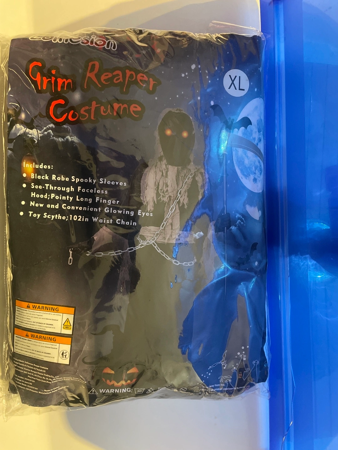 A Grim Reaper costume in an XL size. Includes the black robe, sleeves, and more. Putting on a costume like this can be a fun way to get into the spirit of the season.