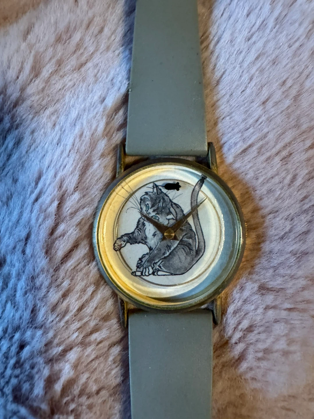 This is a charming vintage watch featuring a detailed sketch of a tabby cat on the face. It has a light grey, durable strap and a classic metal casing. It's a fun accessory for any cat lover!