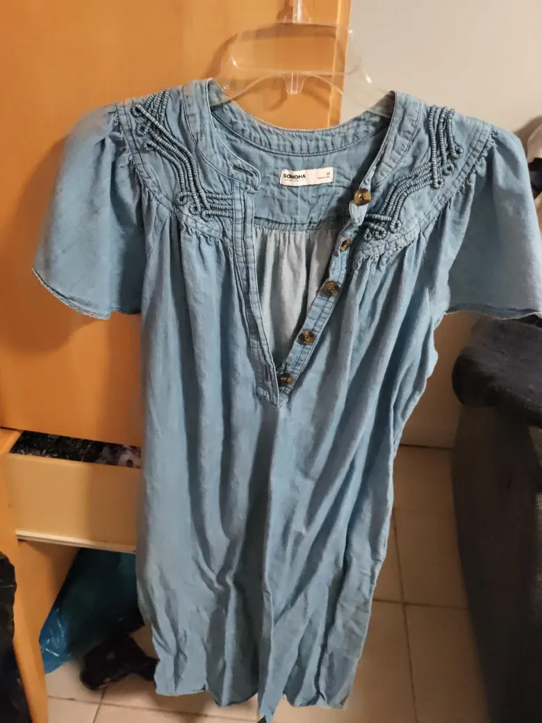 Selling a cute Sonoma jean dress in size medium! It's a light wash denim color with unique detailing around the shoulders and chest. Perfect for a casual day out!