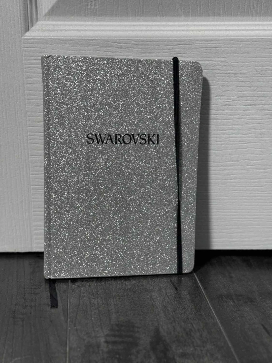 Sparkly silver notebook by Swarovski. Elastic band closure keeps it secure. It's perfect for jotting down thoughts or plans!