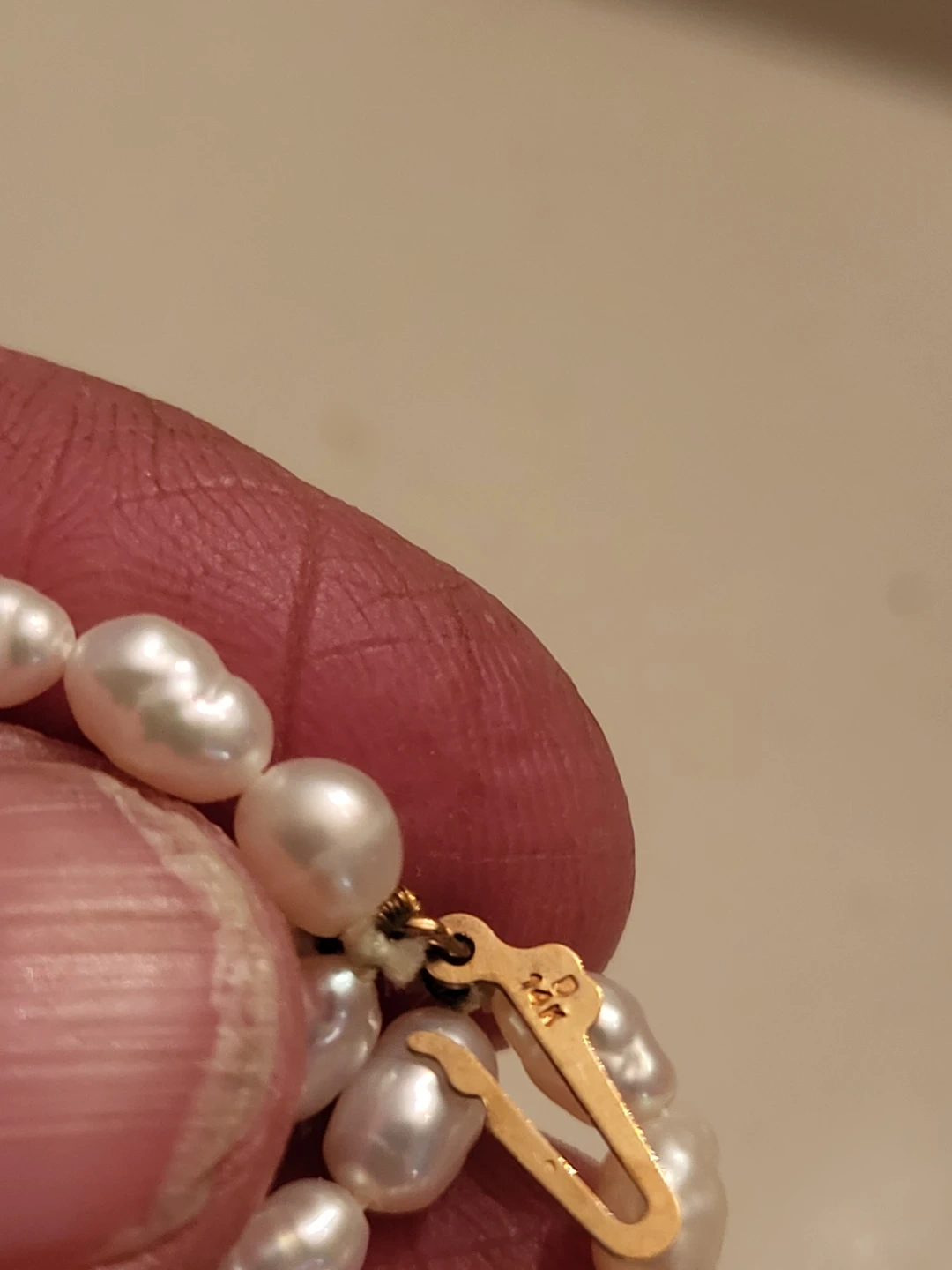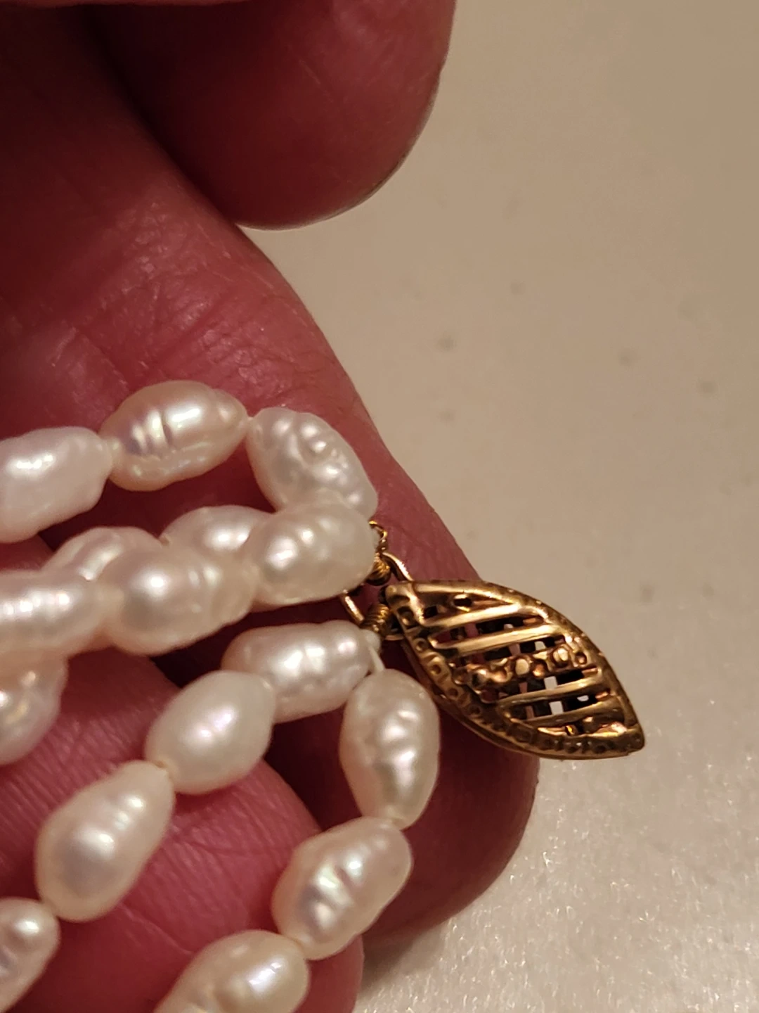 This elegant necklace features five strands of iridescent freshwater pearls. It's secured with a beautiful 14K gold clasp. Perfect for adding a touch of sophistication to any outfit!