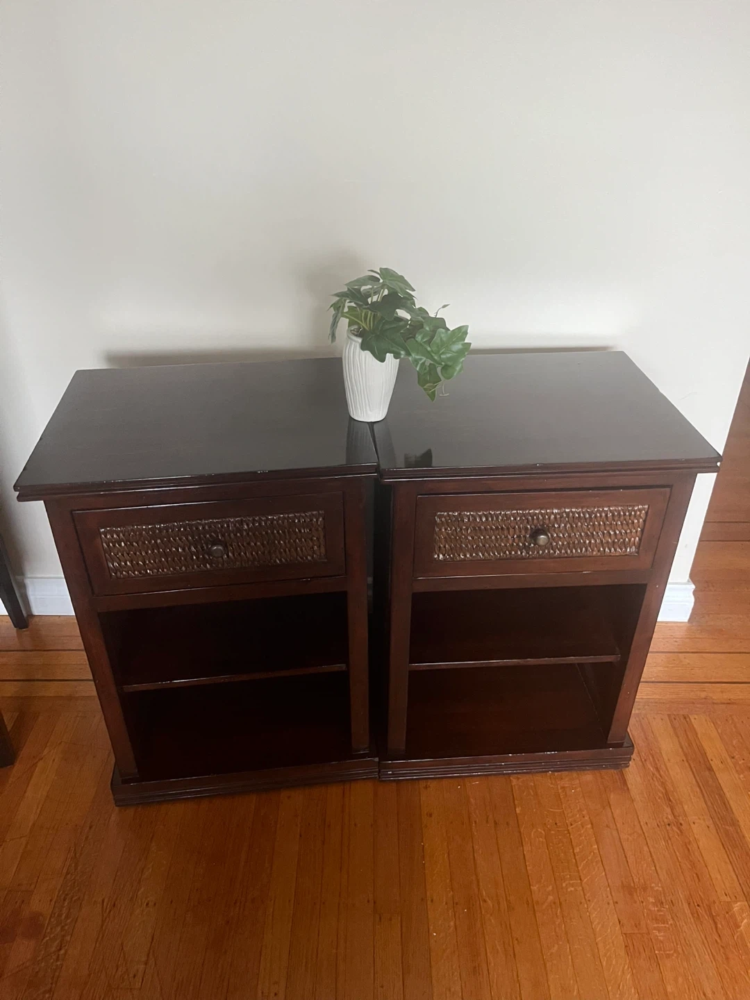 Two matching dark wood nightstands with woven drawer fronts. Each unit has one drawer and an open shelf below. Perfect for a bedroom or living area needing extra storage!