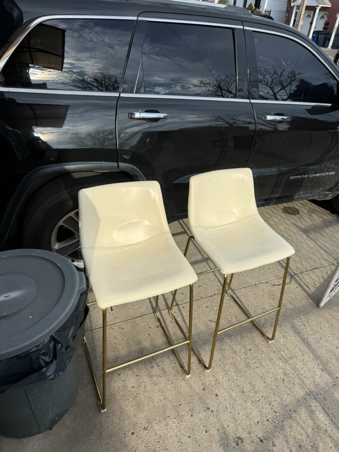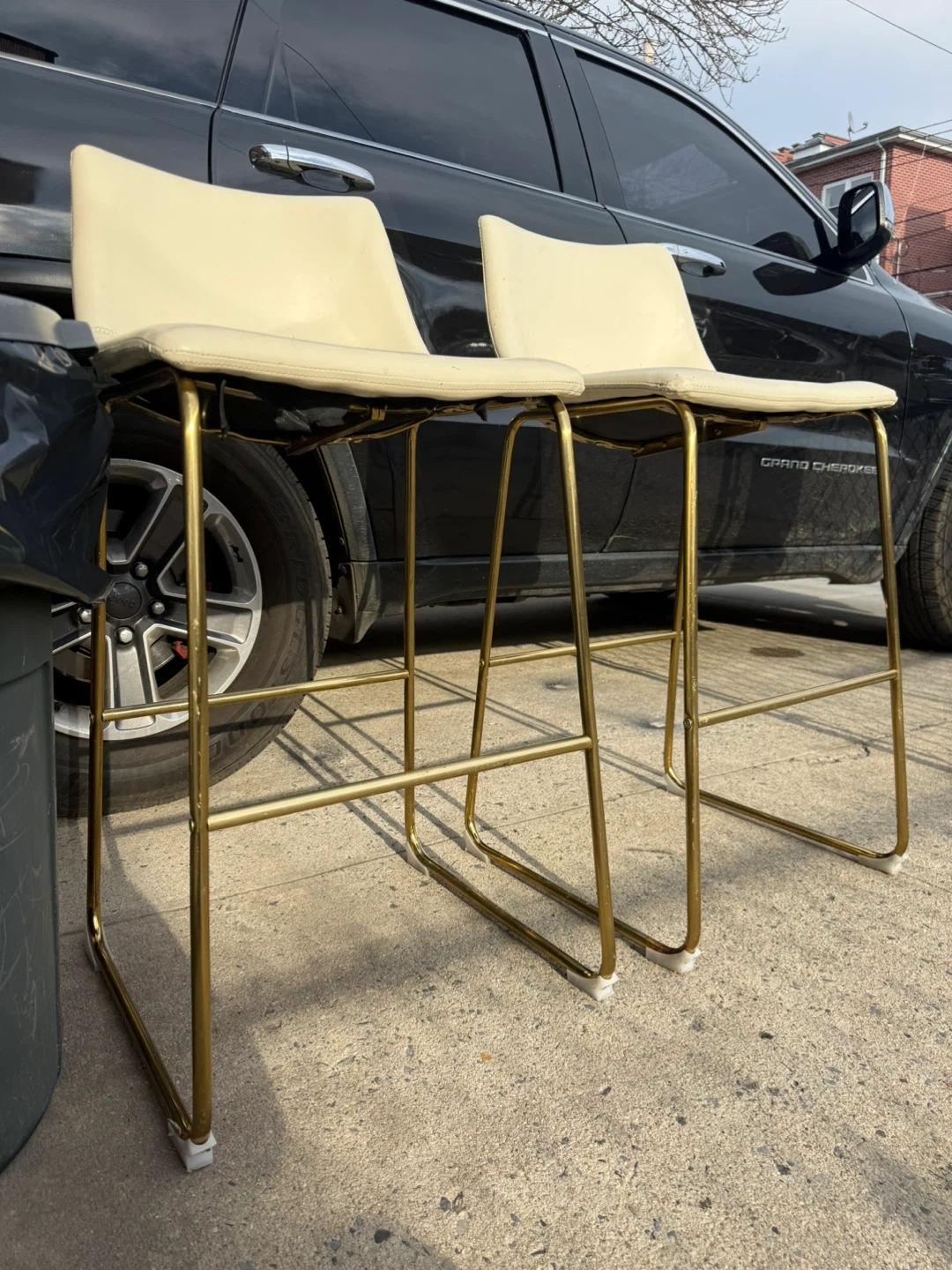 Selling a set of two cream-colored bar stools. They feature a sleek design with gold-tone metal legs. Perfect for a kitchen island or home bar! These stools offer a comfortable seating option for your home.