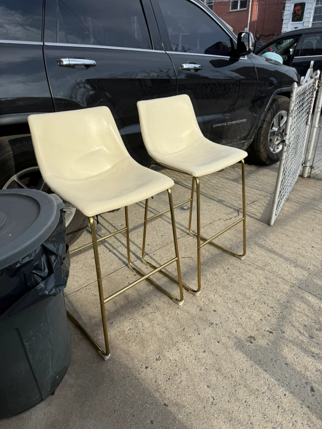 Selling a set of two cream-colored bar stools. They feature a sleek design with gold-tone metal legs. Perfect for a kitchen island or home bar! These stools offer a comfortable seating option for your home.