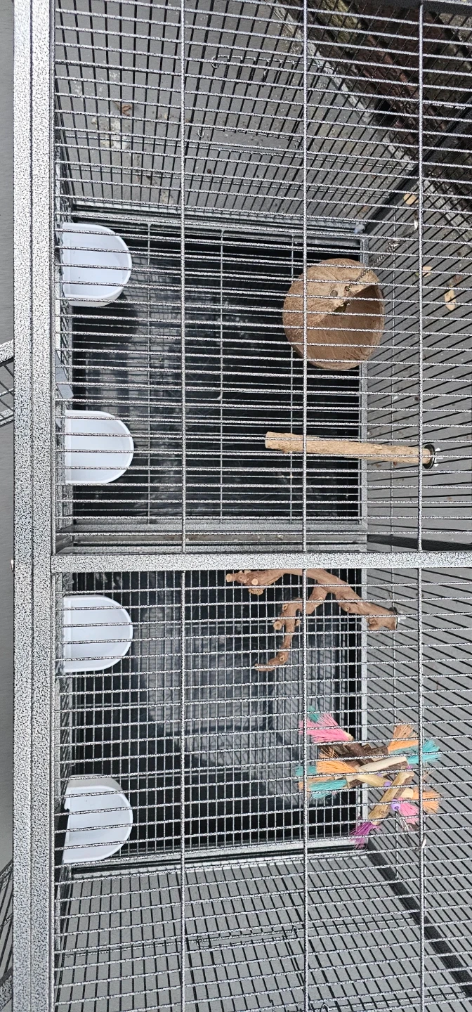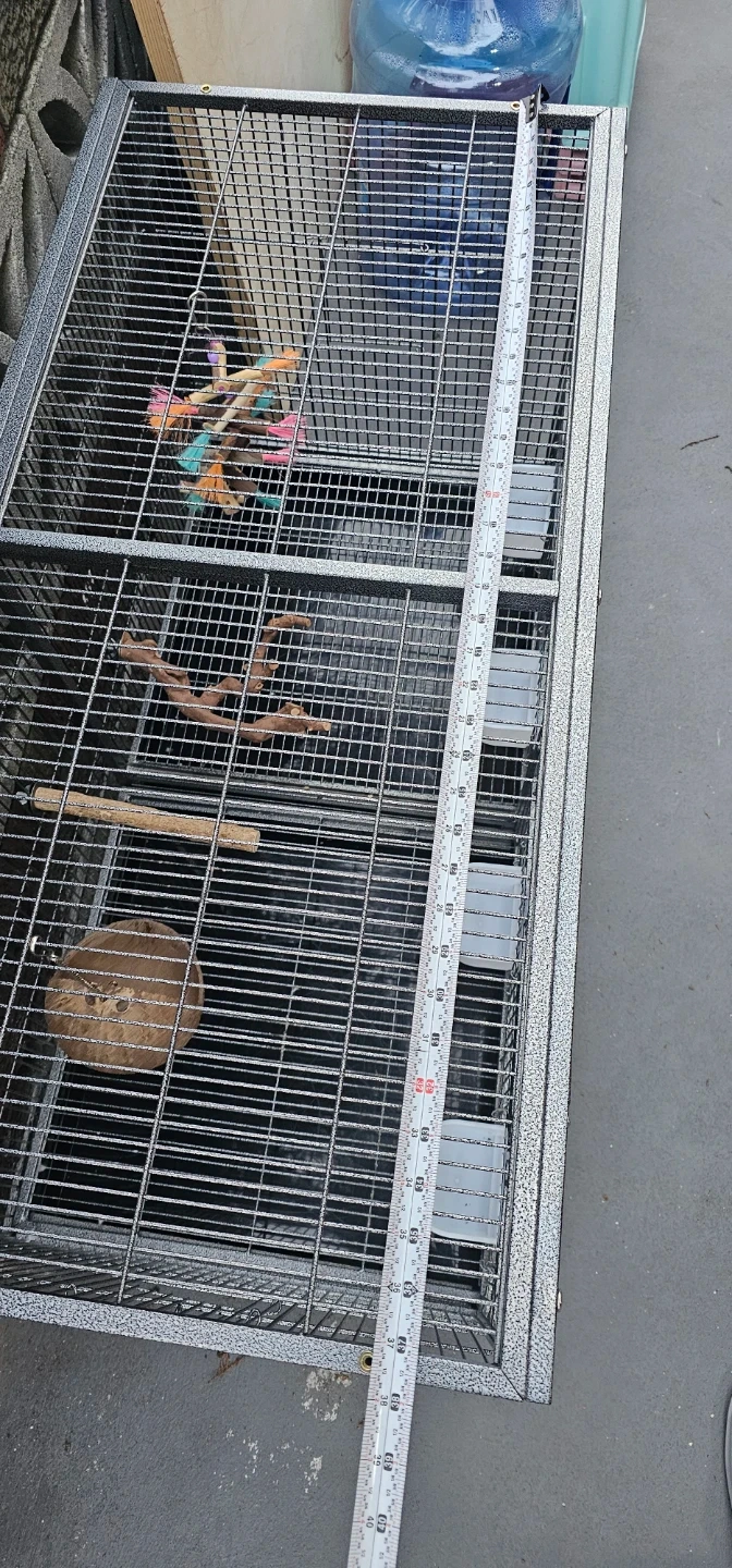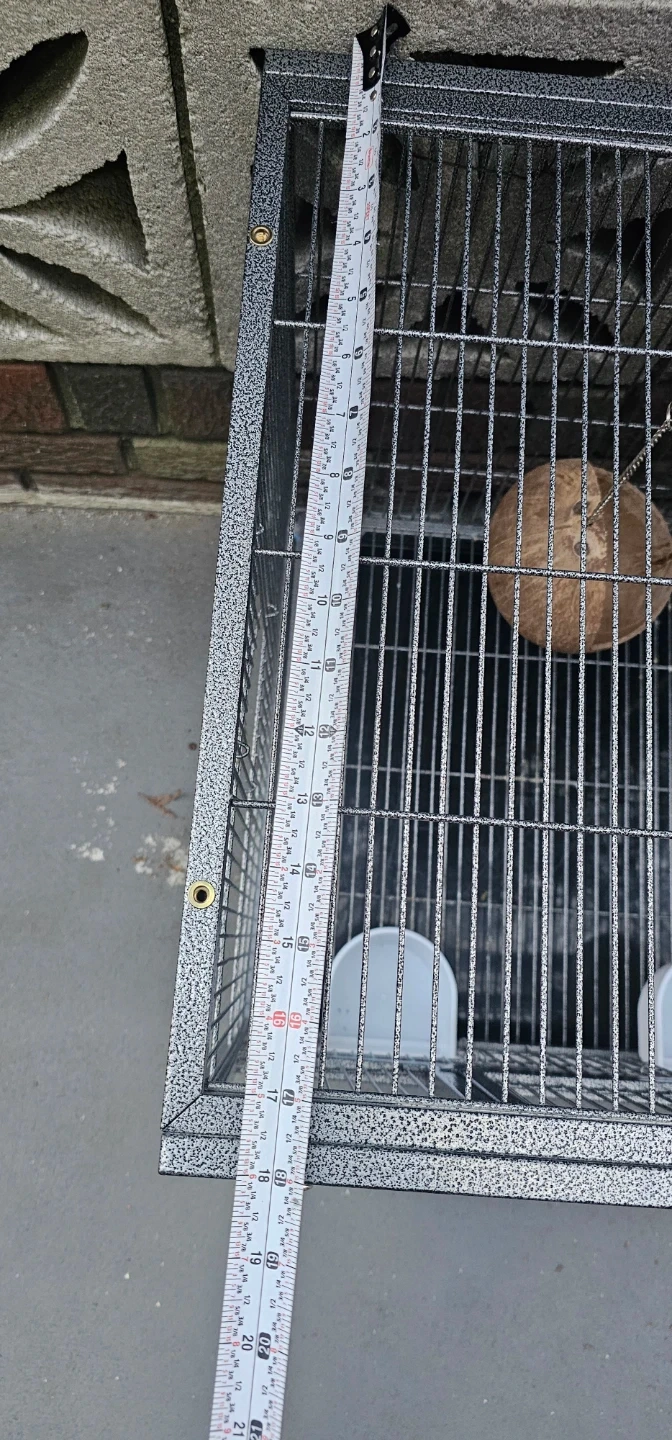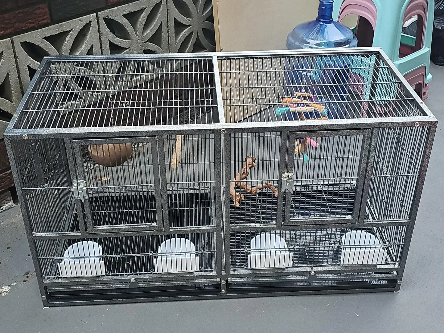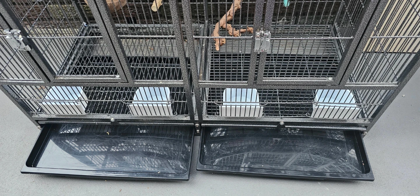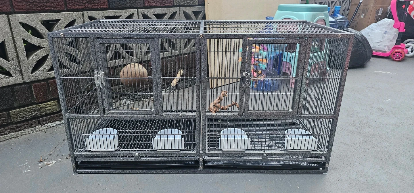 This is a large, 38W×18D×20H double-compartment bird cage. It's made of durable metal wire with a gray speckled finish. The cage includes four food and water bowls and multiple perches. Each compartment has a front door and a smaller access door.