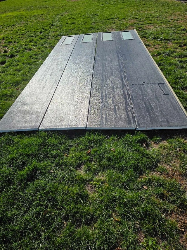 16x8 insulated garage door (16ft wide x 8ft high) Made by Garaga in Canada. Polyurethane insulated R12. Single pane frosted windows. Black. Previously installed. Door has some delamination as shown in pictures, may have some scratches. $800 for door panels only. $1000 complete with all hardware, tracks, springs, shaft, weatherstrip etc. Aluminum frame capping available for extra. Insured for liability. Located in St. Williams area. For Sale By: Owner.