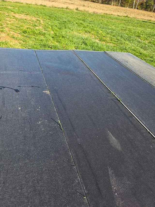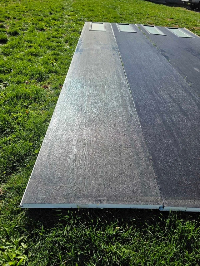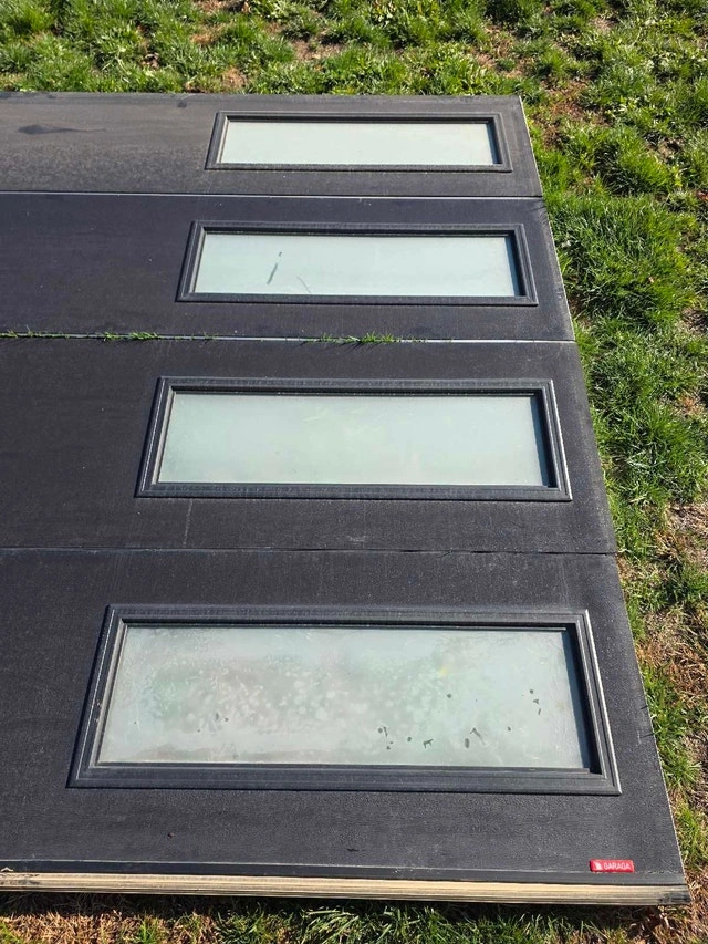16x8 insulated garage door (16ft wide x 8ft high) Made by Garaga in Canada. Polyurethane insulated R12. Single pane frosted windows. Black. Previously installed. Door has some delamination as shown in pictures, may have some scratches. $800 for door panels only. $1000 complete with all hardware, tracks, springs, shaft, weatherstrip etc. Aluminum frame capping available for extra. Insured for liability. Located in St. Williams area. For Sale By: Owner.
