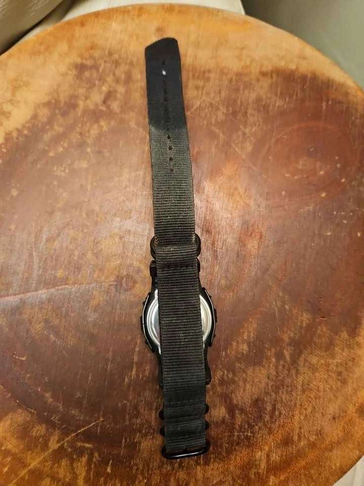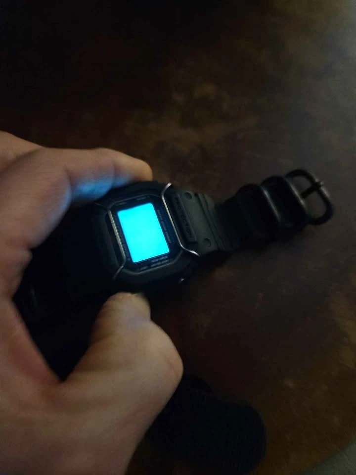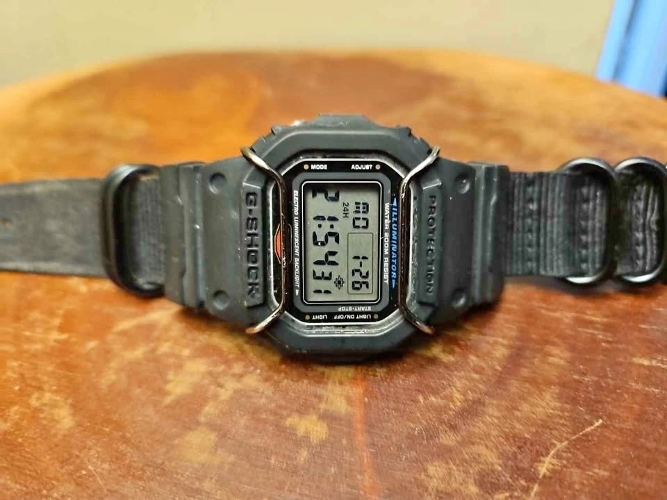 Vintage G Shock DW5600 with 1545 module, made in Thailand. Modded with a nylon Nato style strap and bull bars. Currently running and sold as is.