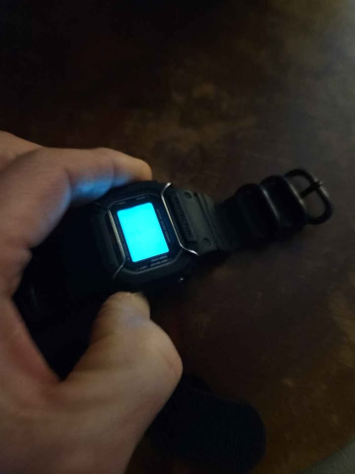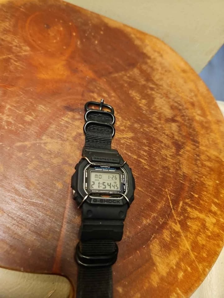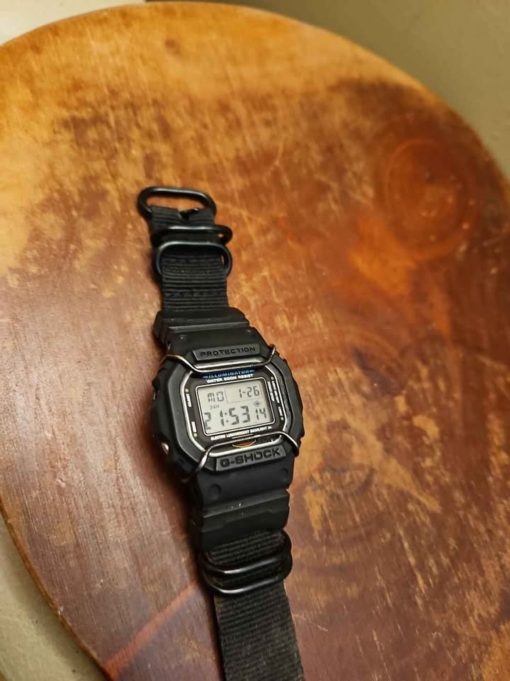 Vintage G Shock DW5600 with 1545 module, made in Thailand. Modded with a nylon Nato style strap and bull bars. Currently running and sold as is.