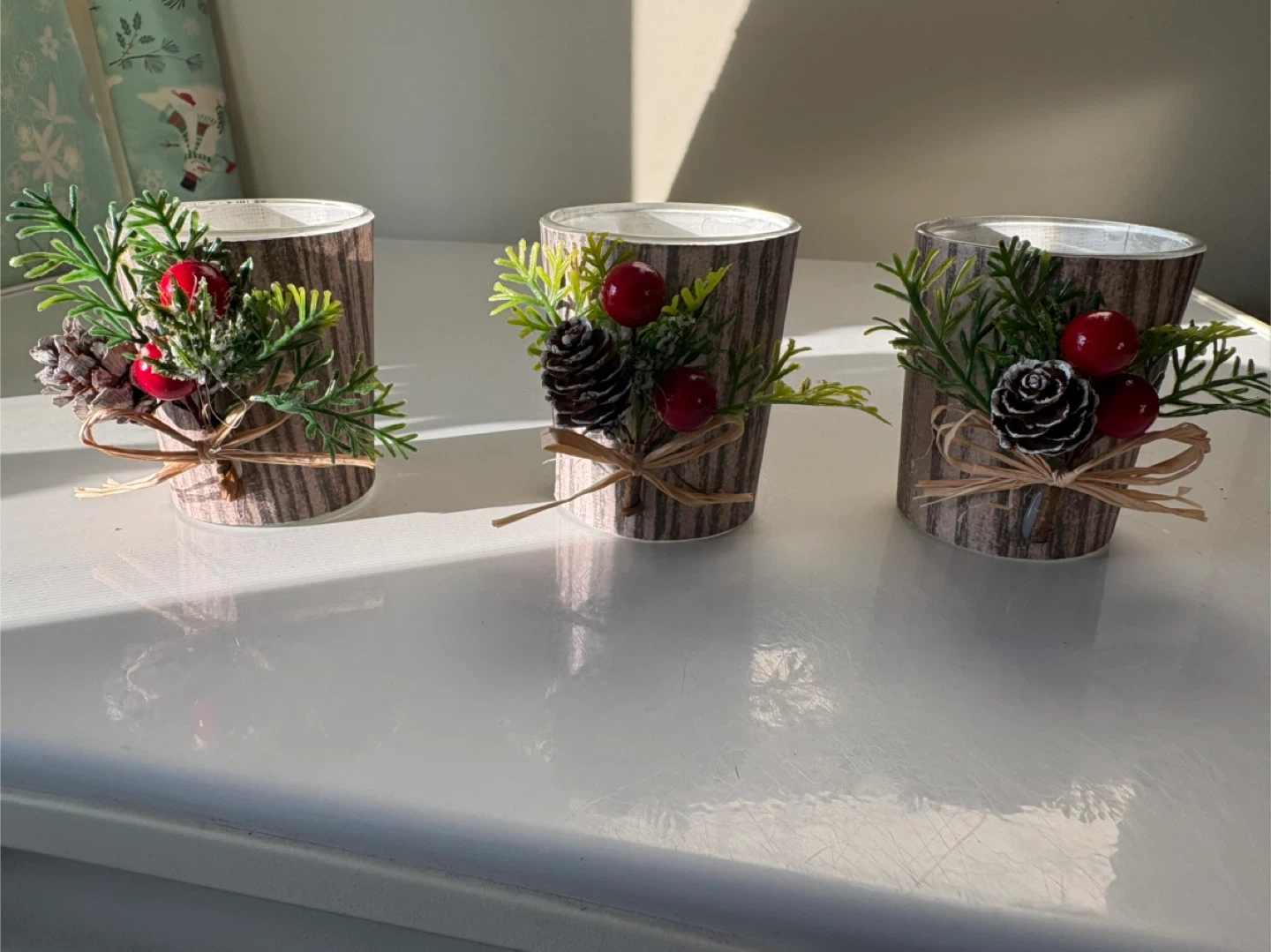 Free! Brand new: Three festive glass candle holders with tea lights included.