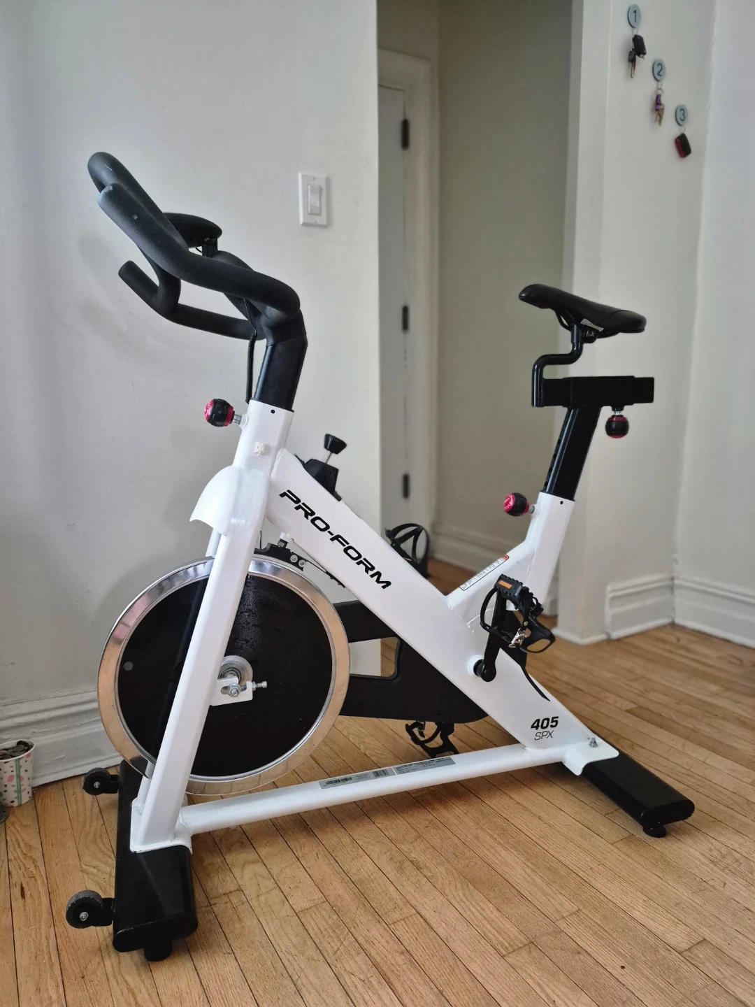 This white ProForm 405 SPX spin bike is ready for your workouts. It's a sturdy piece of exercise equipment for home use. The bike has adjustable seat and handlebars. Its compact design fits well in most spaces. ππ»
