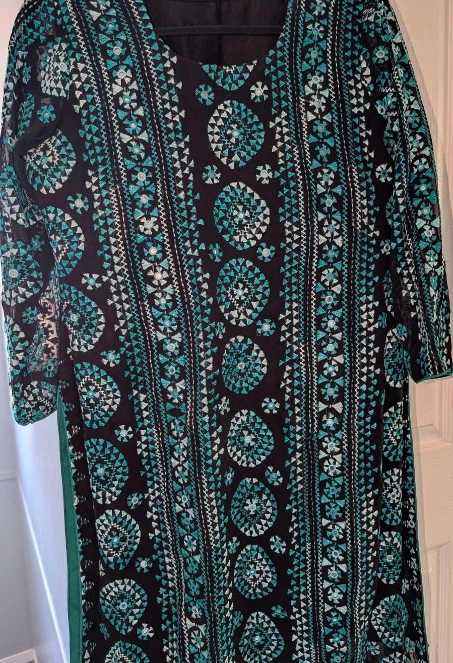 Beautifully embroidered and mirror work on a black dress with teal patterns. Includes a matching sheer dupatta with embroidered details. Great for special occasions!