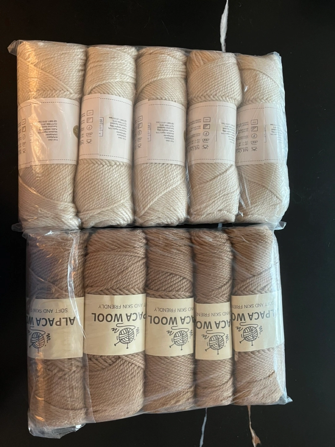Ten skeins of alpaca wool yarn. Five skeins are a light beige and five are a light brown. Soft and skin friendly. 100g each.