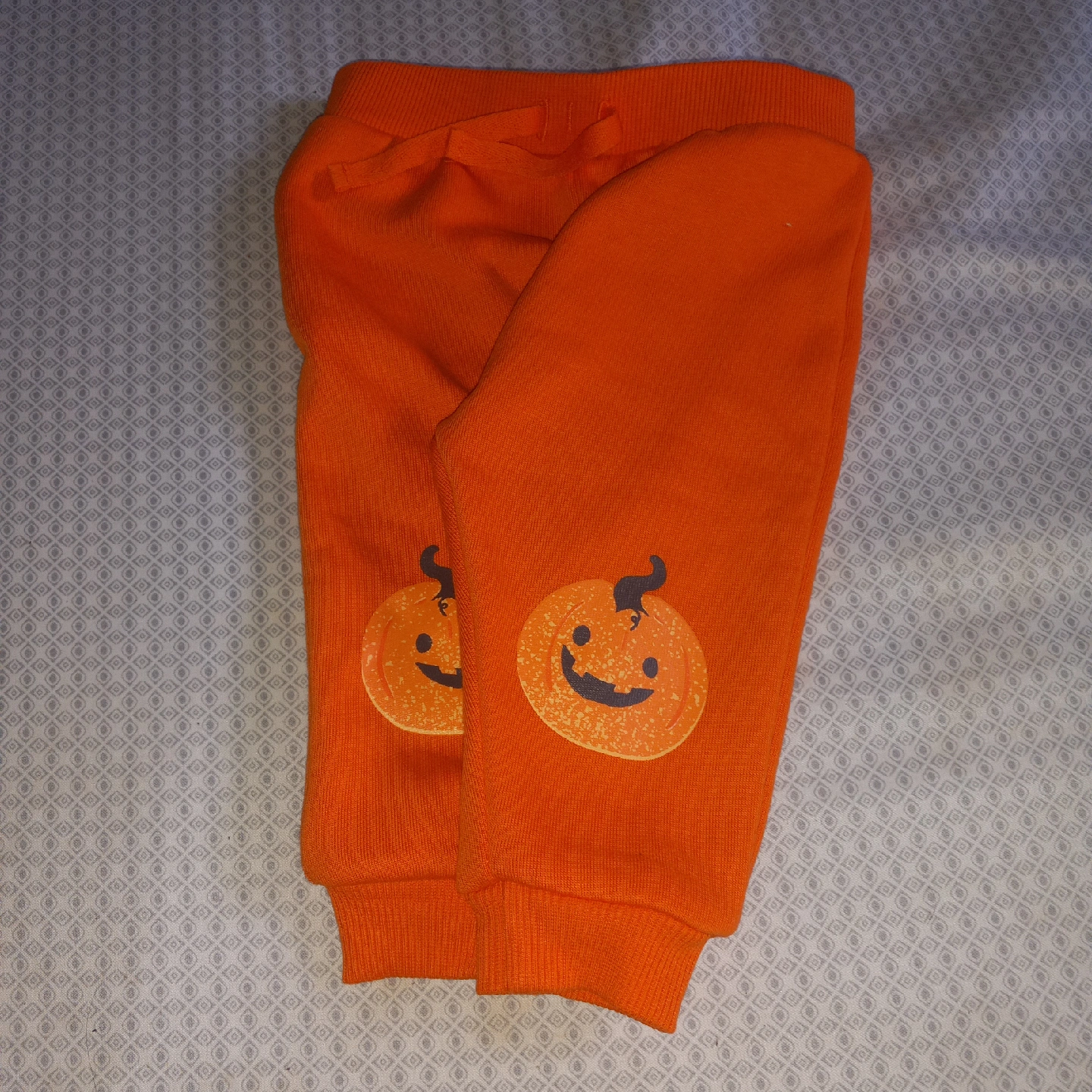 Super cute Halloween themed outfit for babies aged 3-6 months! The set includes a long-sleeved shirt with a pumpkin and ghost design, and matching orange pants with pumpkin knee patches. Perfect for your little pumpkin!