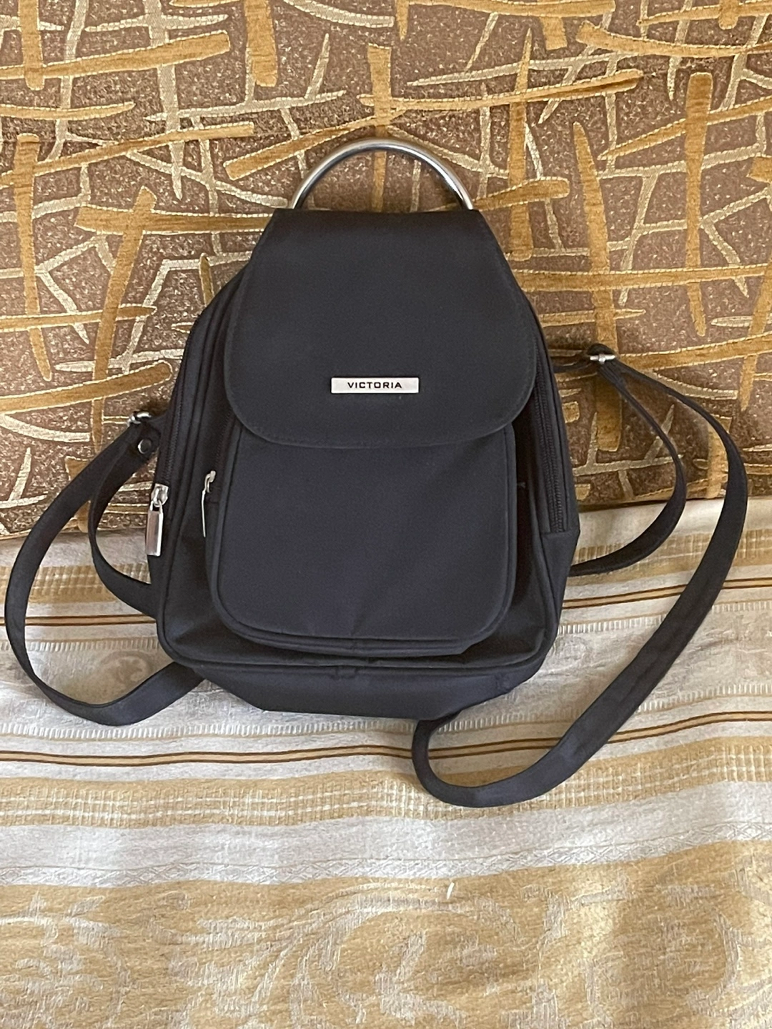 Small black backpack. Features a top handle and adjustable straps. Zipper closure. Multiple pockets.
